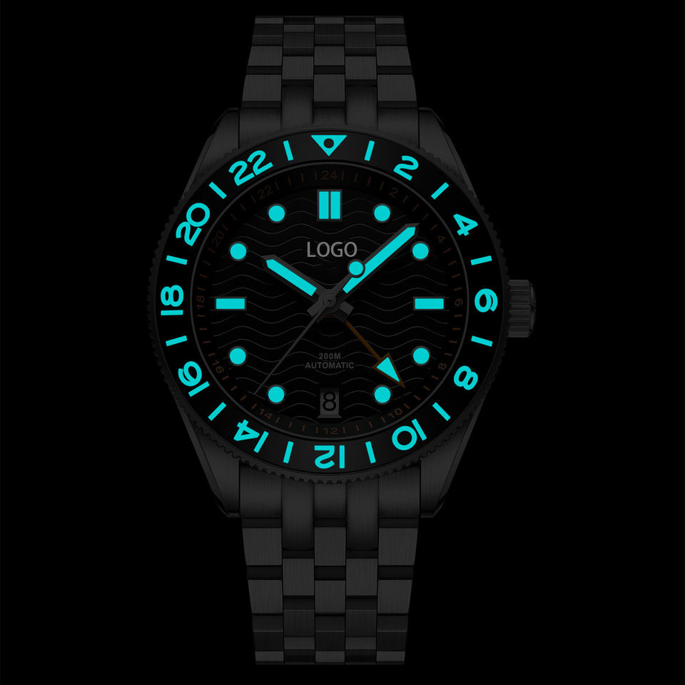 40 มม.Wave Dial GMT 200M นาฬิกาดําน้ําอัตโนมัติ,24 คลิ๊ก Bi-Directional หมุนเซรามิค BEZEL
