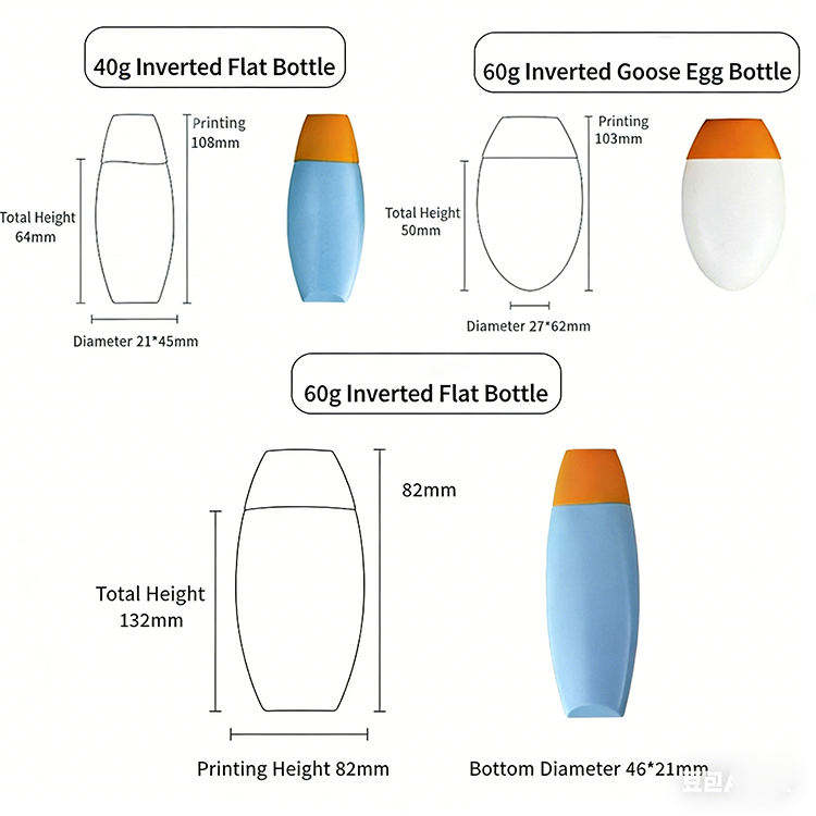 ขวดพลาสติกเปล่าทรงรี ขนาด 40 กรัม/60 กรัม สำหรับรองพื้นแบบกลับด้าน ครีมกันแดด ครีมบำรุงมือ สามารถปรับแต่งสีและโลโก้ได้