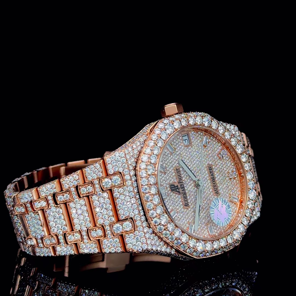 นาฬิกาควอตซ์หรูหราขนาด 41 มม. ตัวเรือนสแตนเลสสตีลสีเงินและโรสโกลด์ ประดับเพชรโมอิสซาไนต์คุณภาพสูงแบบ VVS เต็มหน้าปัด