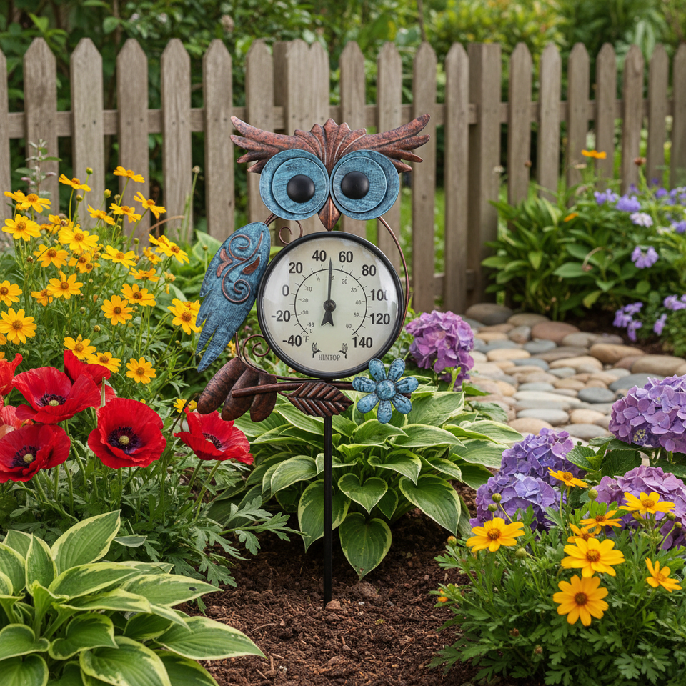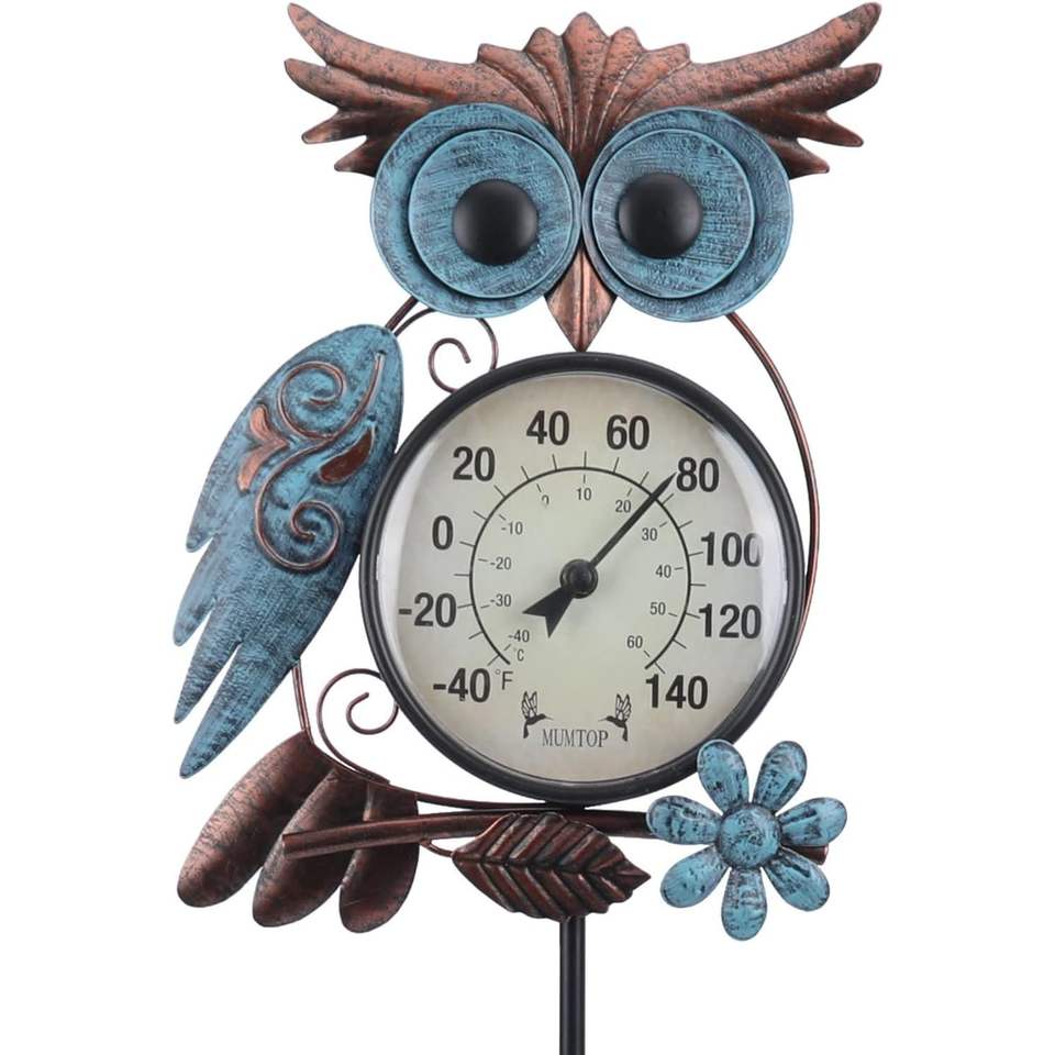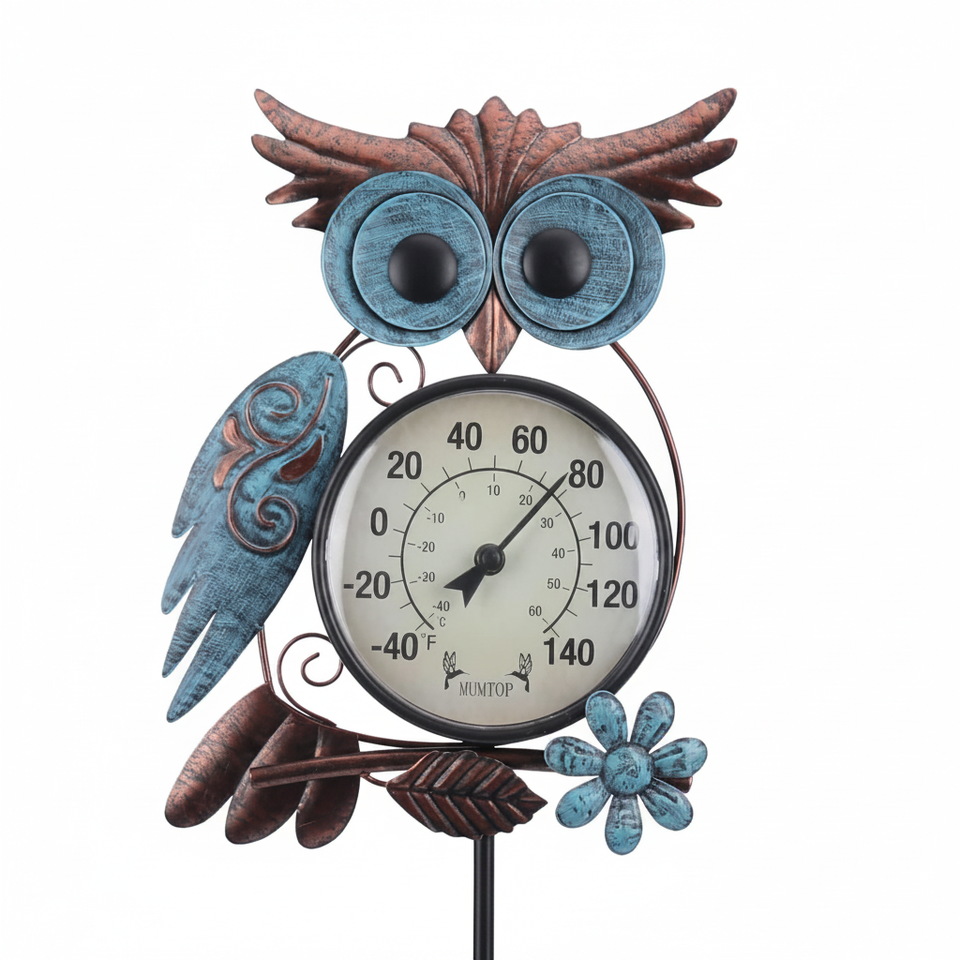 เทอร์โมมิเตอร์วัดอุณหภูมิกลางแจ้งแบบติดผนังรูปนกฮูกโลหะขนาด 42 นิ้ว สำหรับลานบ้าน สวน และใช้ในครัวเรือน
