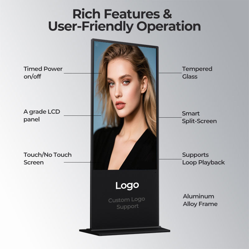 จอแสดงผลดิจิทัลแบบสัมผัสขนาด 43/49/55/65/85/98 นิ้ว ความละเอียด 4K พร้อมขาตั้งพื้นสำหรับใช้งานภายในอาคาร เหมาะสำหรับการโฆษณาแบบอินเทอร์แอคทีฟในร้านค้า