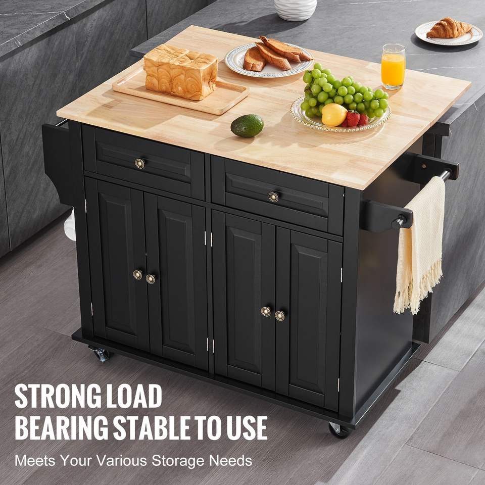 รถเข็นครัวเคลื่อนที่ขนาด 43 นิ้ว พร้อมท็อปไม้ โต๊ะพับได้ ชั้นวางเครื่องเทศ ราวแขวนผ้า และตู้เก็บของปรับระดับได้