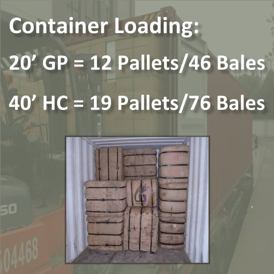 Loading:46 bales/20ft or 76 bales/40ft HC Container