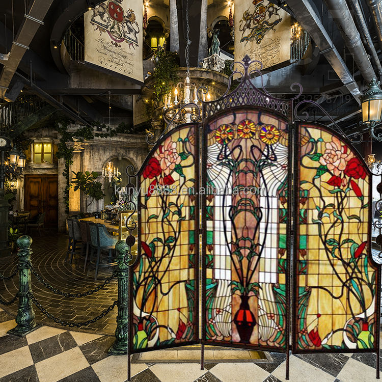 ฉากกั้นกระจกเหล็กทิฟฟานี่ลายกุหลาบแบบพับสามตอน ขนาด 47''*59'' ทำด้วยมือ ทนทาน เหมาะสำหรับตกแต่งวิลล่า