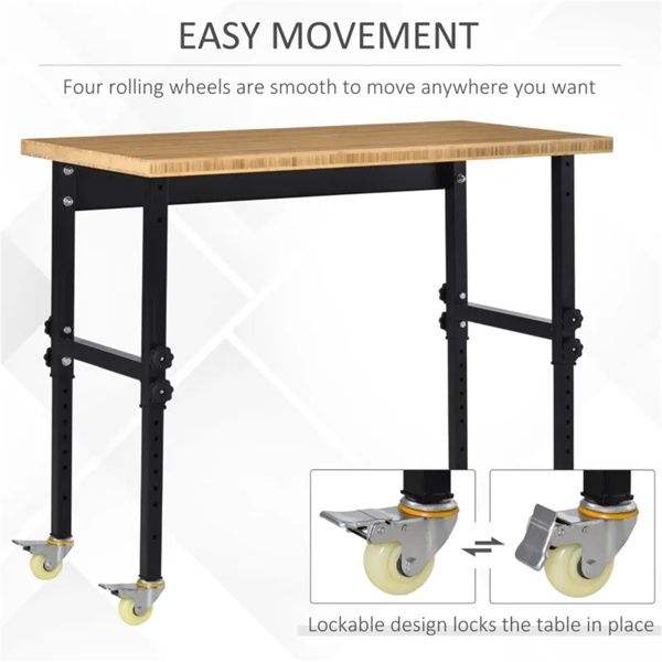 47\" Bamboo Tabletop Workbench with Wheels Height Adjustable Legs Garage Workstation Tool Table Office Furniture
