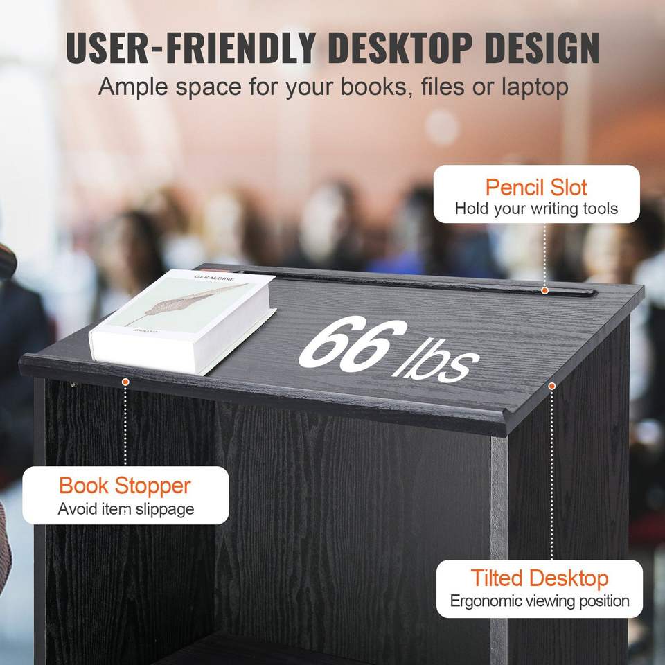 47-Inch Black Wood Podium Stand Rolling Wheels Slant Desktop Lecterns for Church Office School Home-Hostess Stand Storage