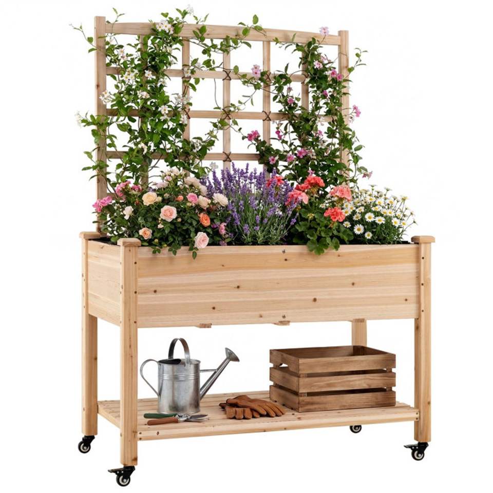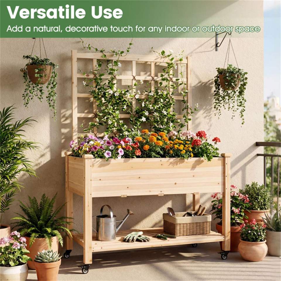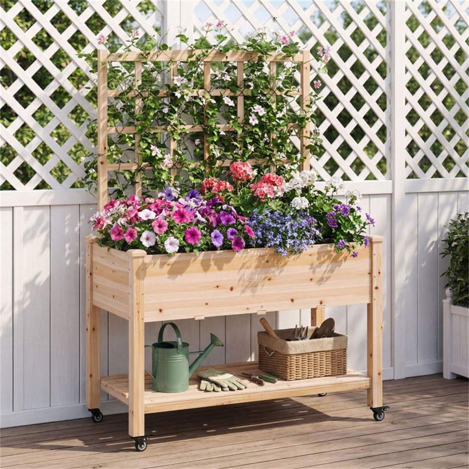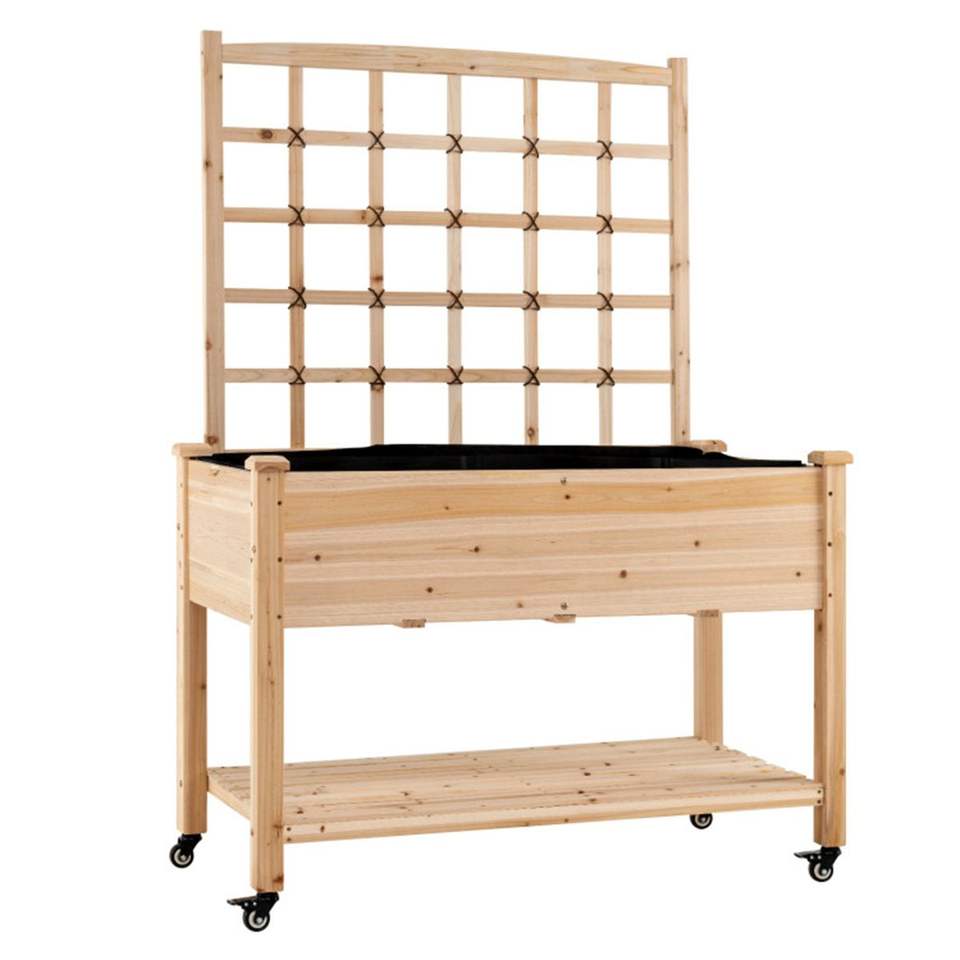 47\" Mobile Fir Wood Planter Box with Trellis Rolling Wheels Raised Garden Bed for Climbing Plants Garden Fencing Trellis Gates