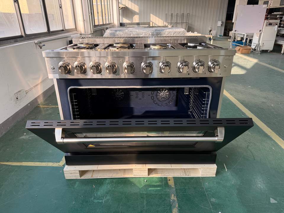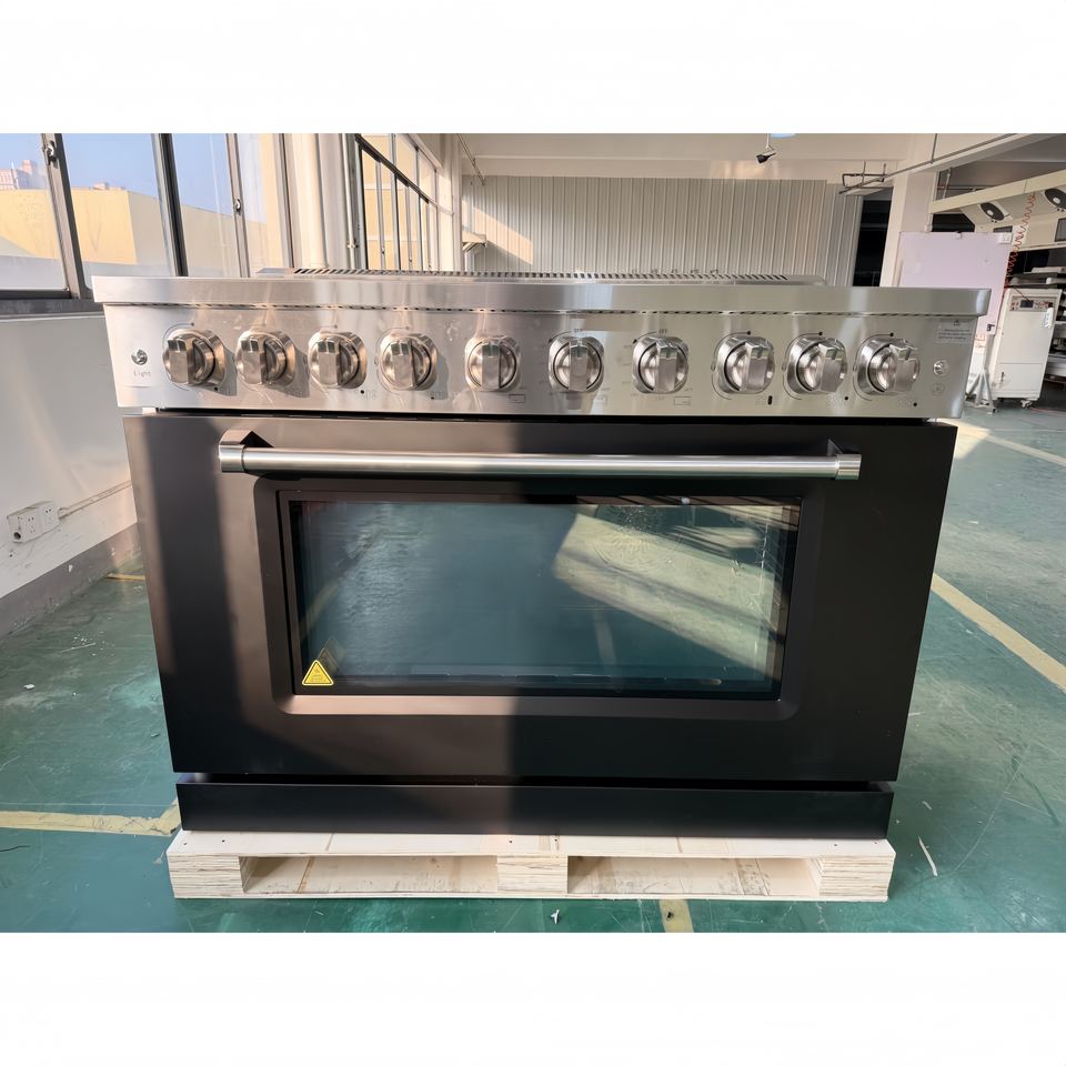 48 นิ้ว 7.84 คิวบิก เตาแก๊สแอลจี 7 หัวเตา พร้อมเตาอบ สแตนเลส พร้อมอุปกรณ์นิรภัยแก๊ส และประตูสีดำด้าน สำหรับใช้ในครัวเรือน