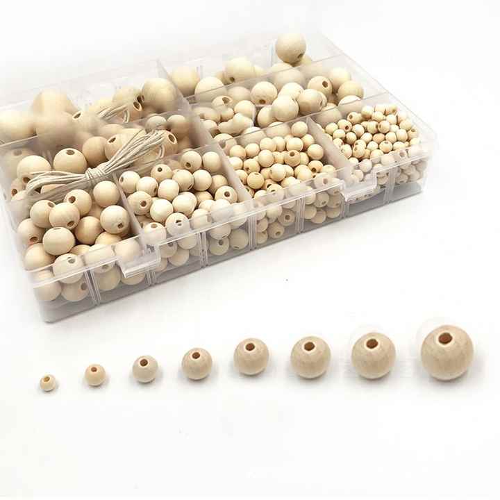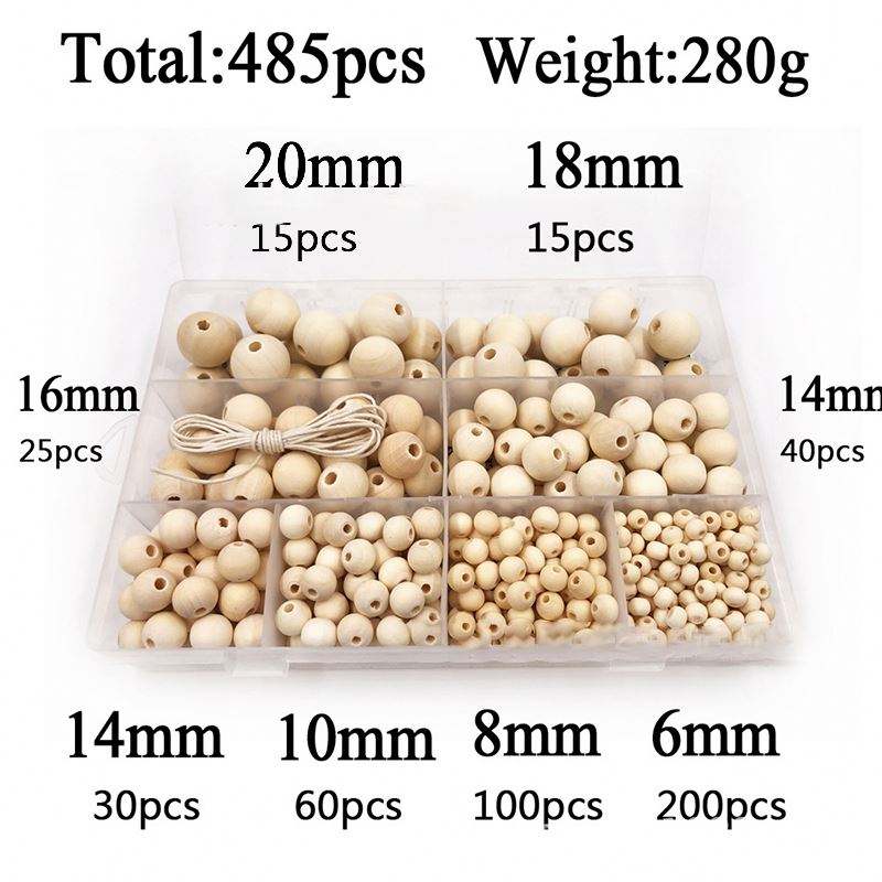 ลูกปัดไม้กลมหลายขนาด485ชิ้นพร้อมกล่องพลาสติกและเชือกสำหรับทำเครื่องประดับ