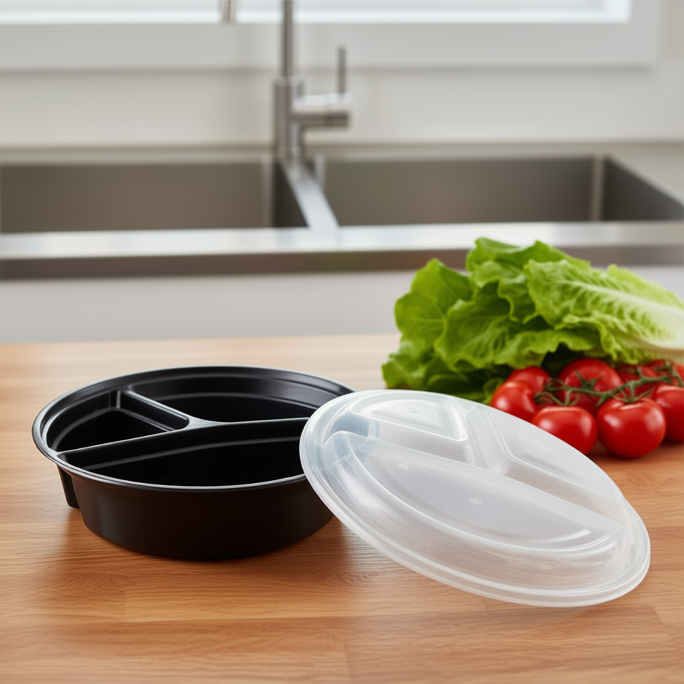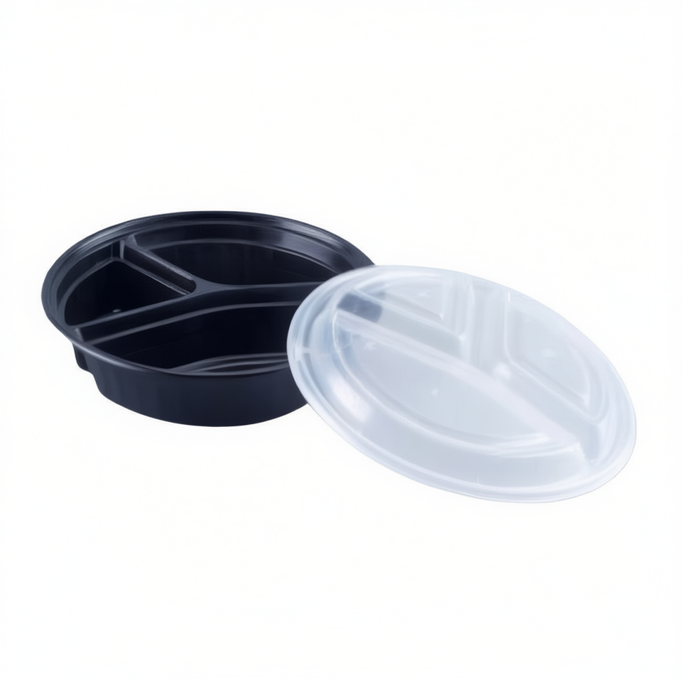 กล่องเก็บอาหารทรงกลม PP ขนาด 48 ออนซ์ พร้อมช่องแบ่ง 3 ช่อง