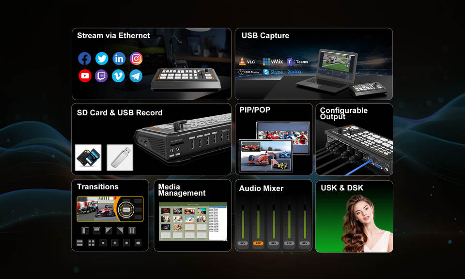 4CH สำหรับตัวเปลี่ยนวิดีโอเครื่องบันทึกการถ่ายทอดสด RTMP SRT Dual USB captview AV Mixer Metal สำหรับ OBS YouTube Facebook