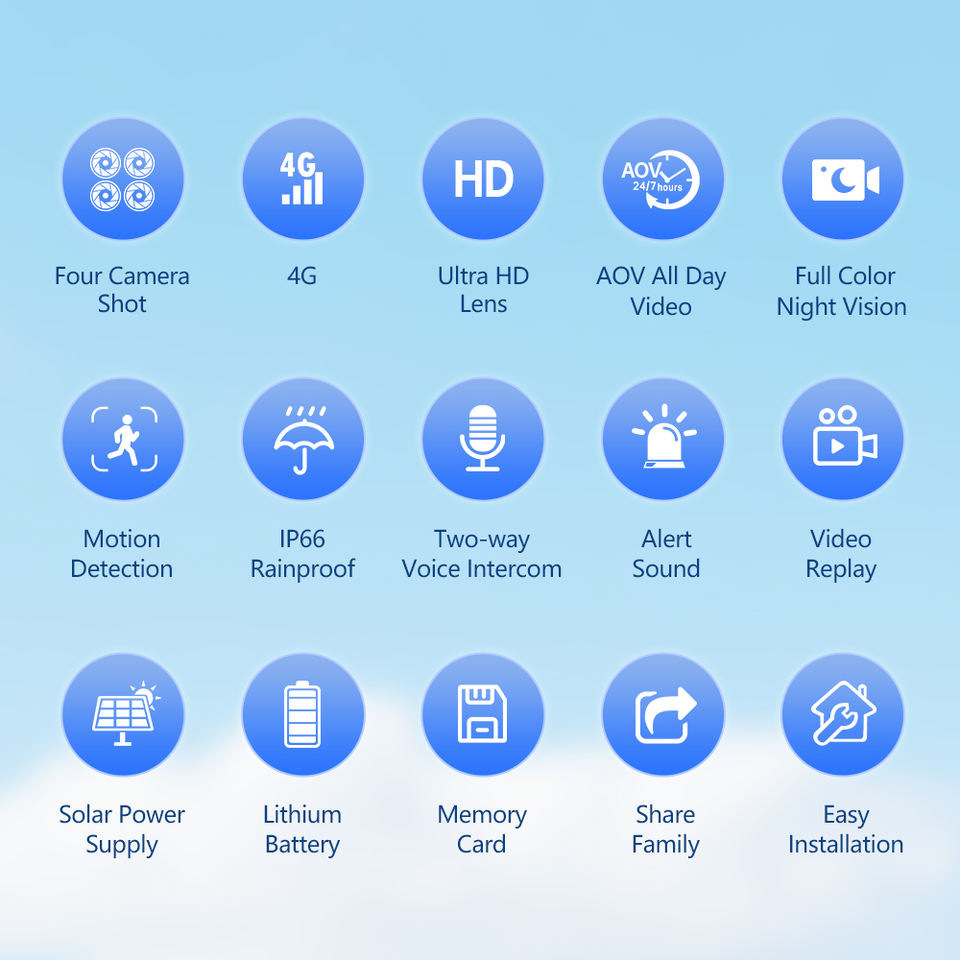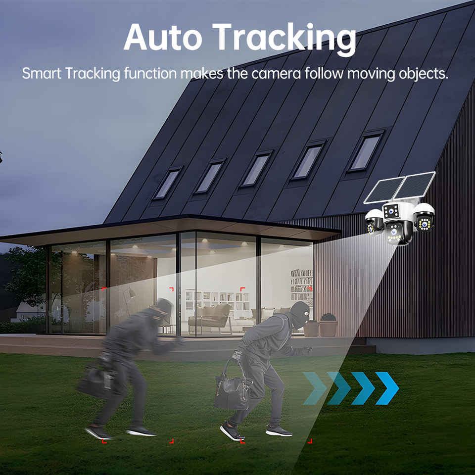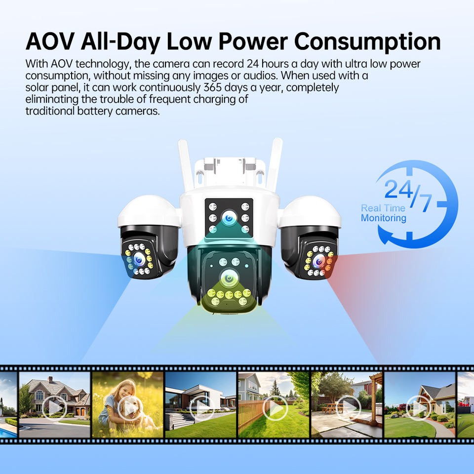 กล้องวงจรปิดพลังงานแสงอาทิตย์ 4G PTZ ความละเอียด 12MP (เลนส์ 3MP*4) กล้องไร้สายสำหรับภายนอกอาคาร 4 จอ บันทึกภาพ 24/7 สำหรับใช้ในบ้านและเชิงพาณิชย์ มาตรฐานกันน้ำ IP66