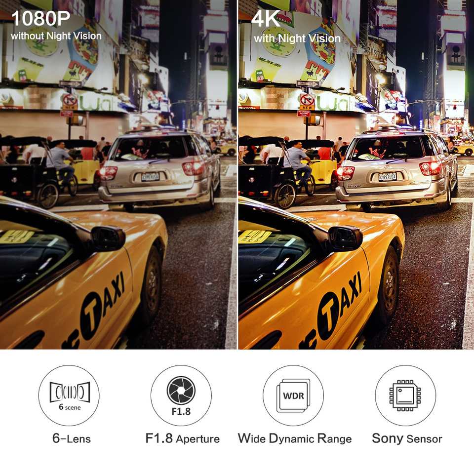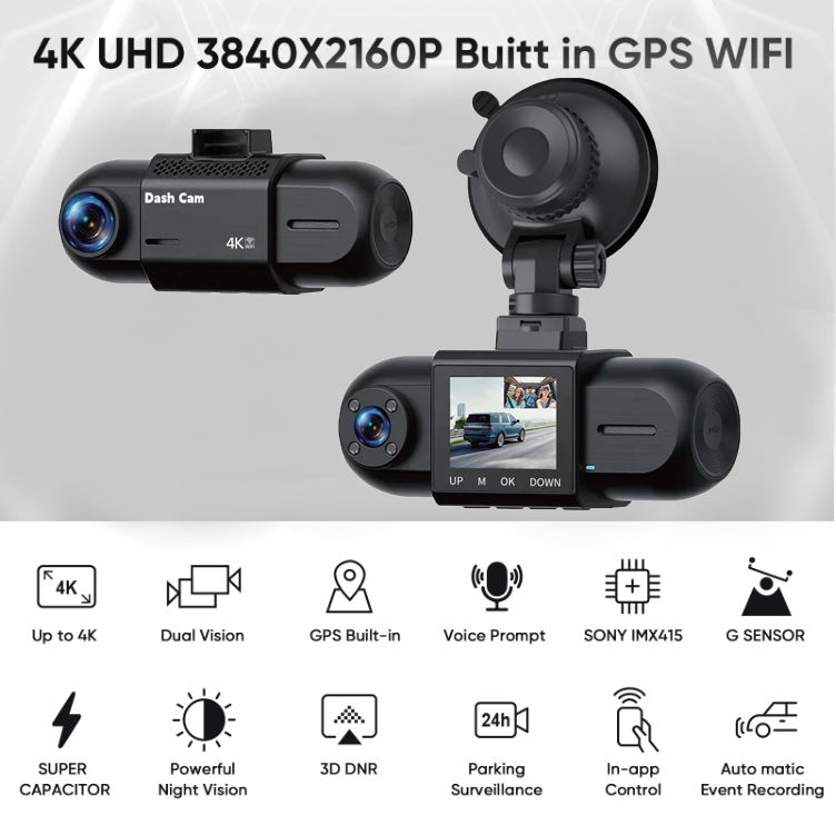 กล้องติดรถยนต์ 4K+1080p 2160P พร้อม WIFI GPS บันทึกภาพแบบ Dual Lens ชิป Novatek 96675 เซ็นเซอร์ Sony IMX323 มองเห็นในเวลากลางคืน กล้องคู่