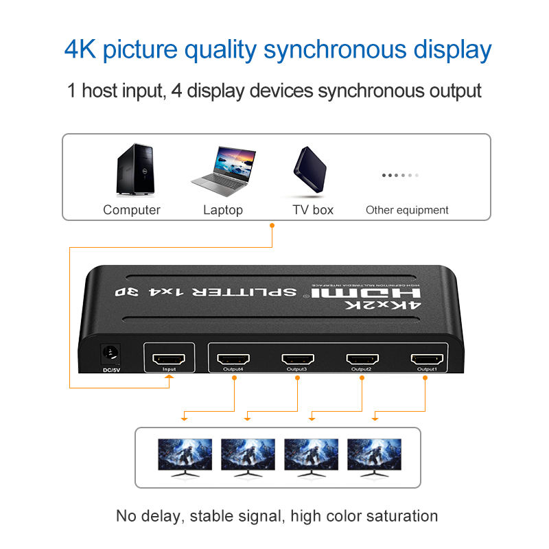 ตัวแยกสัญญาณ HDMI คุณภาพสูง 4K*2K แบบขายส่ง 1x4 ตัวแปลงกระจายสัญญาณสำหรับ PC ทีวี คอนโซล 1 เข้า 4 ออก สำหรับ DVD PS3 HDTV