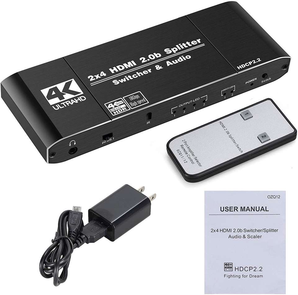 4K @ 60HZ 2x4 HDMI สวิตช์แยกสัญญาณ2.0 3.5mm และสเกลาร์2 in 4 OUT พร้อมรีโมท IR สวิตช์ HDCP2.2 4K 3D แยก HDMI