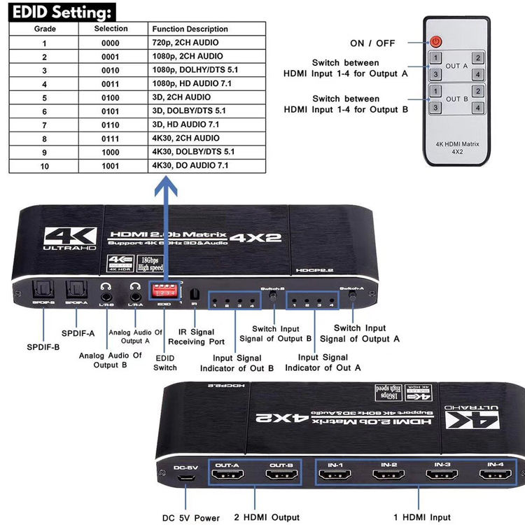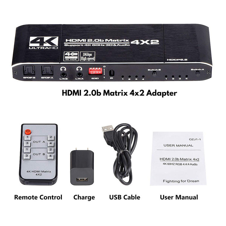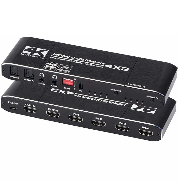 ตัวแยกเมทริกซ์4K/60Hz HDMI 2.0 4X2,พร้อมเสียง Toslink HDR ARC HDMI 4เข้า2ออก