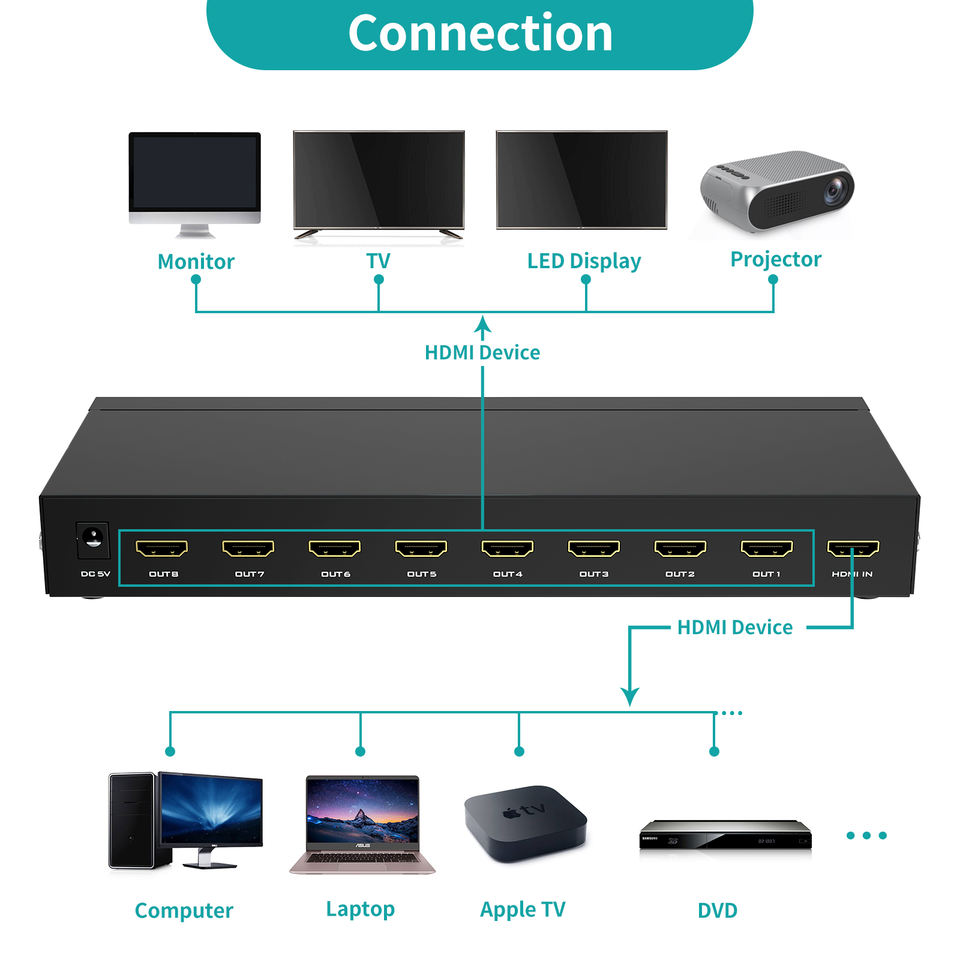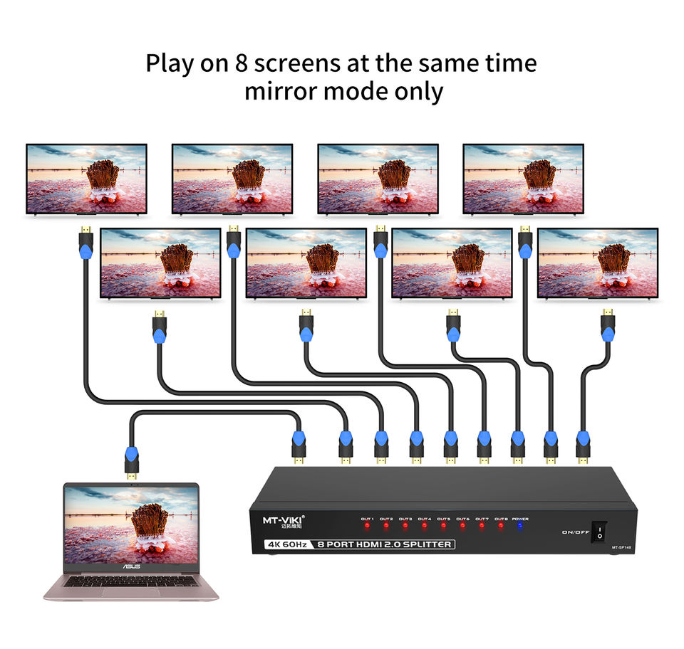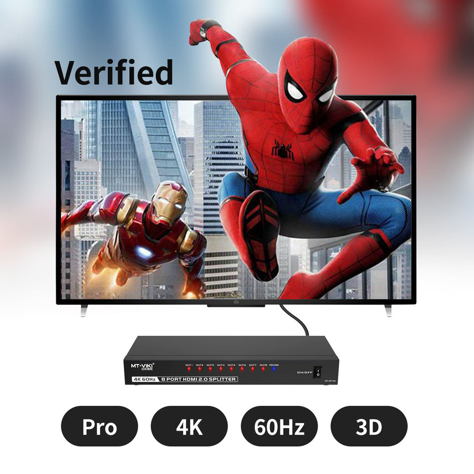 ตัวแยกสัญญาณ HDMI 4K 60Hz 1 เข้า 8 ออก, MT-VIKI 1x8 1 เครื่องคอมพิวเตอร์ 8 จอภาพ + อะแดปเตอร์จ่ายไฟ ตัวแยกสัญญาณ HDMI
