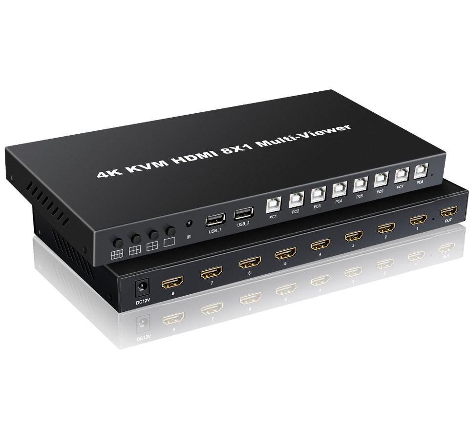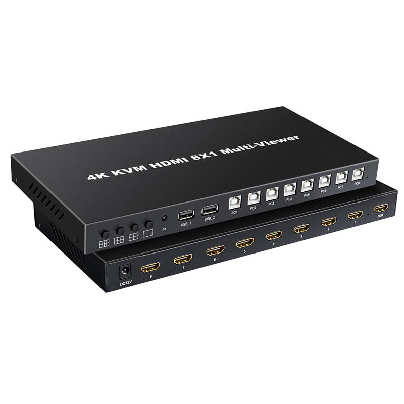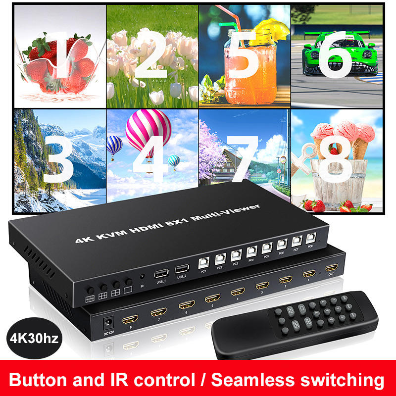 สวิตช์ KVM HDMI 4K 8x1 แบบมัลติวิวเวอร์ สลับสัญญาณได้อย่างราบรื่น 8 อินพุต 1 เอาต์พุต ควบคุมด้วยปุ่มและรีโมทอินฟราเรด