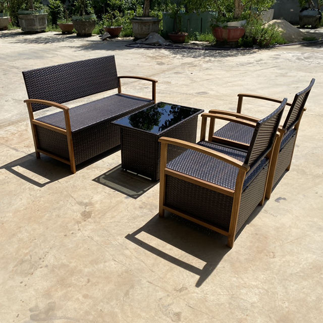 4P00057เซ็ต4ชิ้นดีไซน์ทันสมัยไม้อะคาเซียสีน้ำตาลไม้ PE Wicker ชุดโซฟาไม้สักกลางแจ้งกระจกนิรภัยสำหรับห้องนั่งเล่นโรงแรมสวน