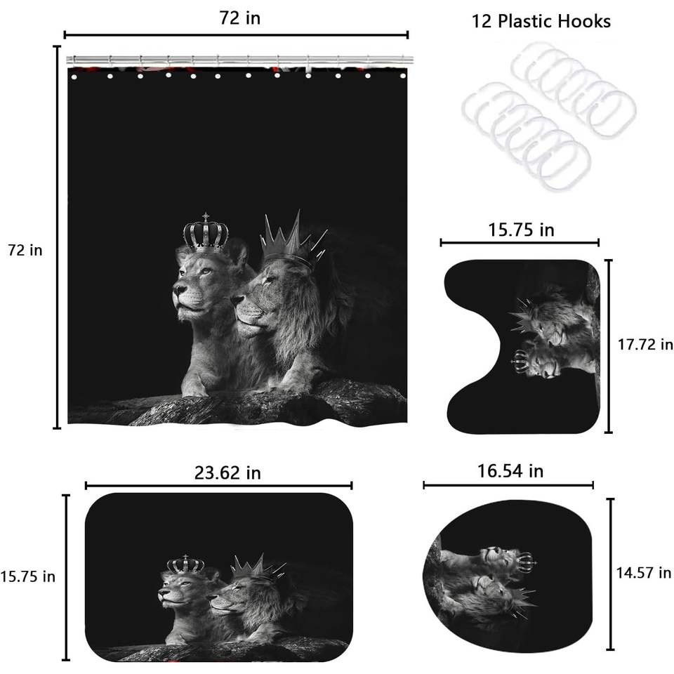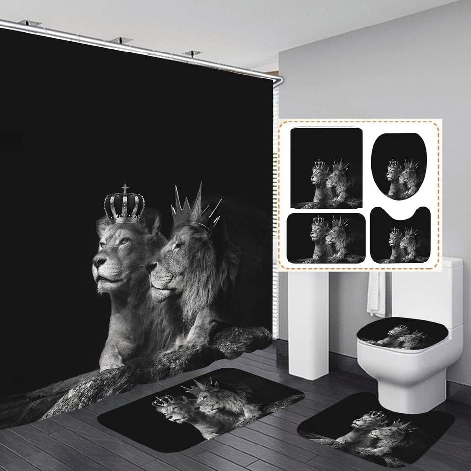 ชุดอุปกรณ์เสริมสำหรับห้องน้ำรูปสัตว์ป่า4ชิ้นม่านสิงโตแอฟริกันมงกุฎพรมกันลื่นฝาปิดฝาชักโครกแผ่นรองสบู่รูปตัวยู