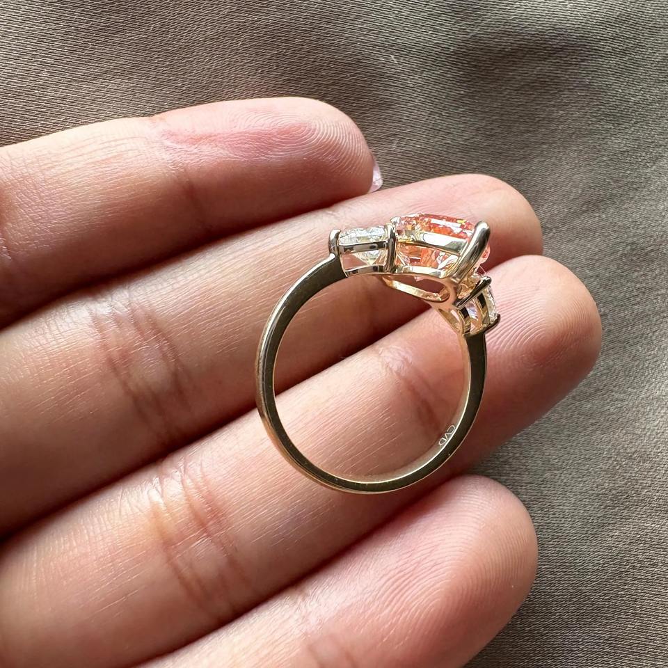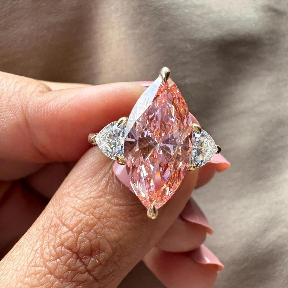 แหวนหมั้นเพชรทรงมาร์ควิส 4 กะรัต สีชมพู เพชรเลี้ยงในห้องปฏิบัติการ ประดับเพชรสามเม็ด ตัวเรือนทอง 14k ผลิตโดยผู้ผลิตเครื่องประดับเพชรที่ได้รับการรับรอง
