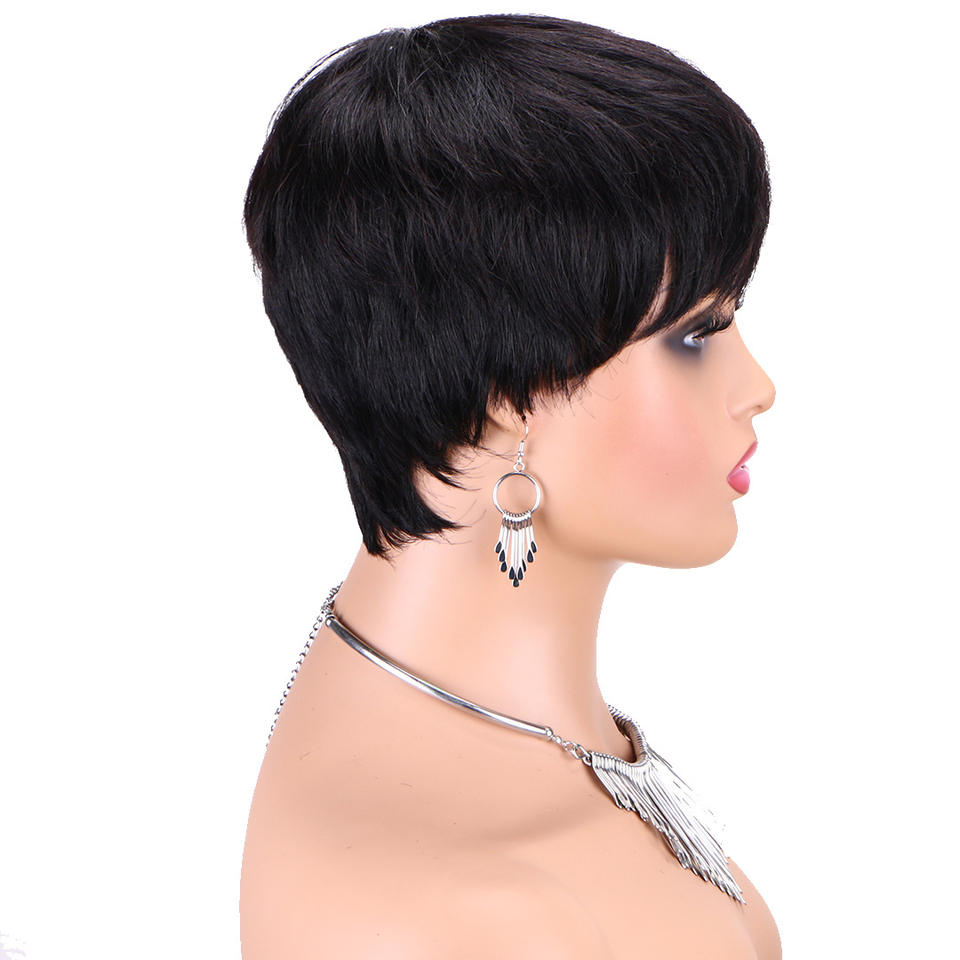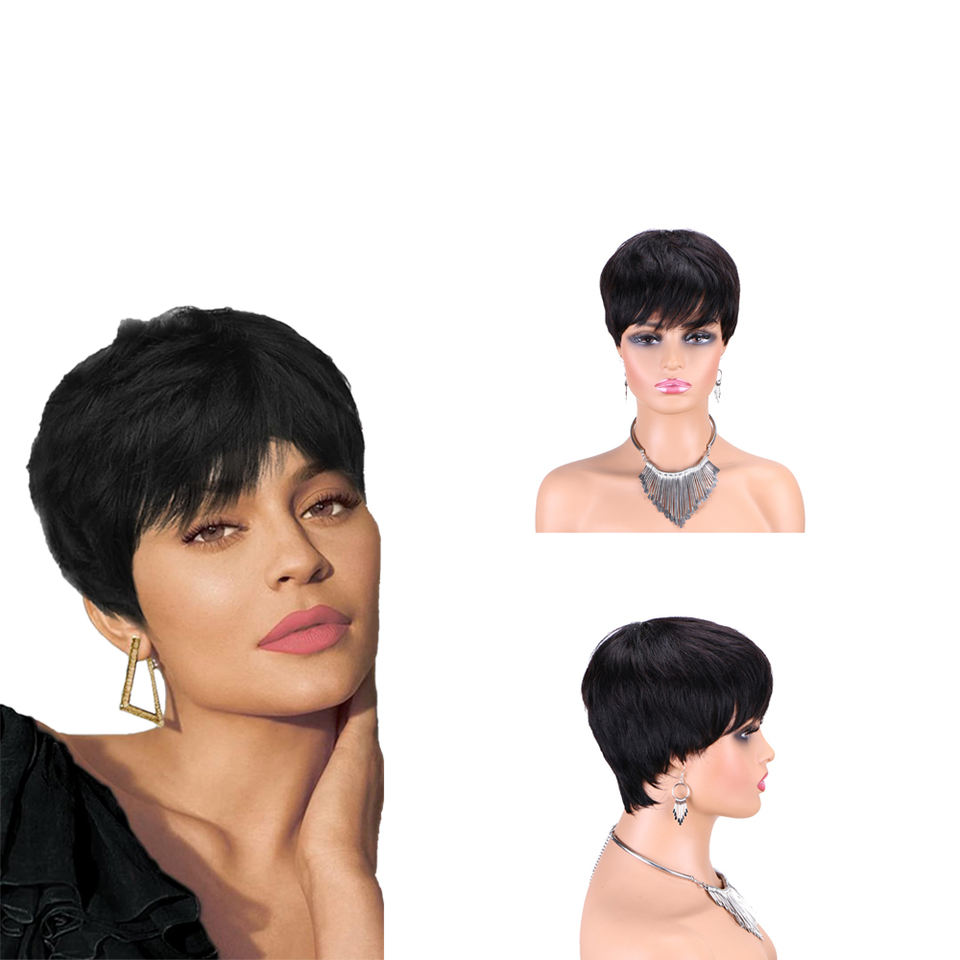 4 นิ้วผมมนุษย์สั้นวิกผม Pixie ตัดวิกผมกับ Bangs สีดําสําหรับผู้หญิงผิวดํา Glueless วิกผมสั้น