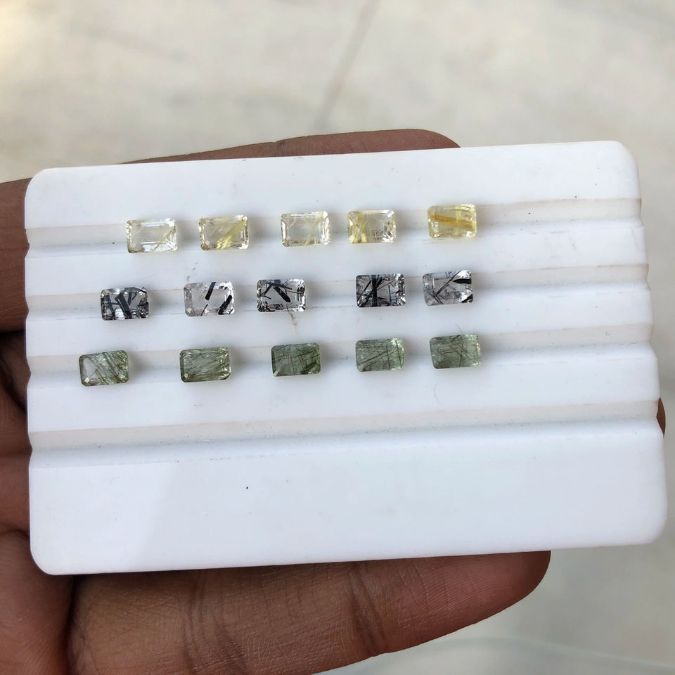 ควอตซ์รูไทล์สีทองเขียวดำธรรมชาติ เจียระไนทรงมรกต รูปทรงแปดเหลี่ยม