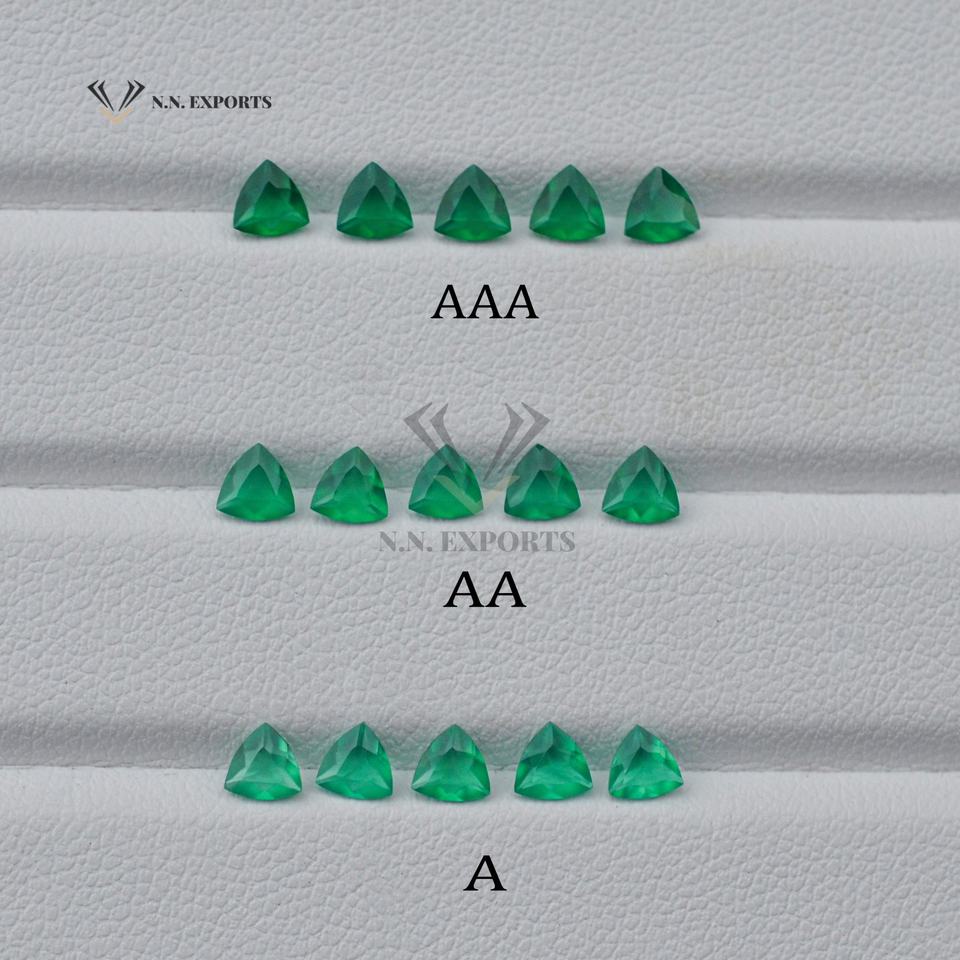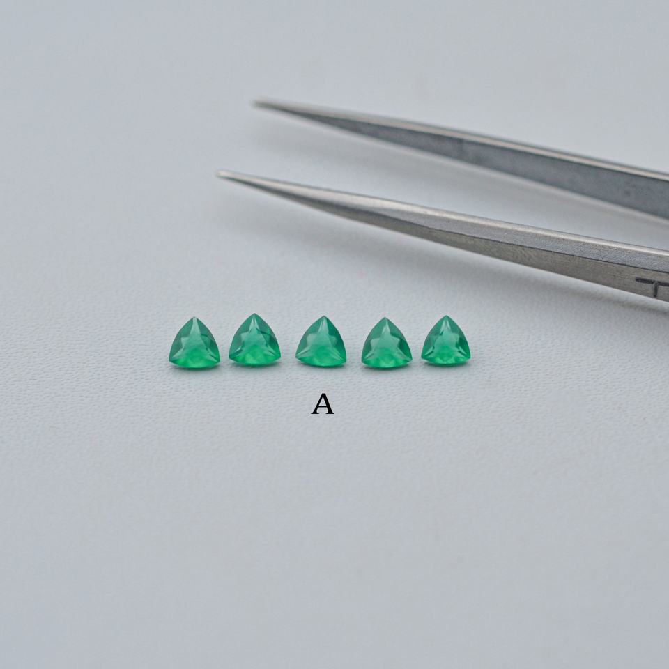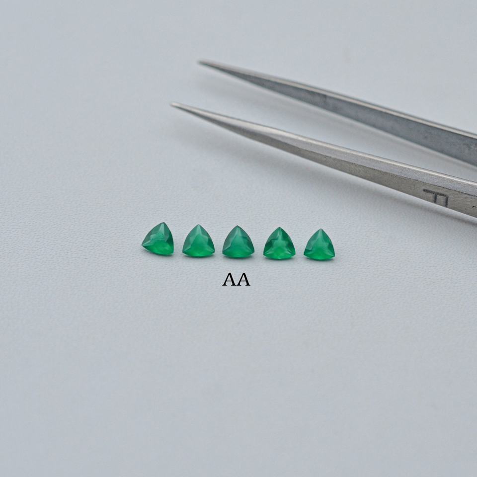 พลอยออนิกซ์สีเขียวธรรมชาติขนาด 4 มม. ทรงทริลเลียนเจียระไน ได้รับการรับรองจาก IGI สำหรับทำเครื่องประดับแบบสั่งทำ งานแฮนด์เมด มีบริการสั่งซื้อจำนวนมาก