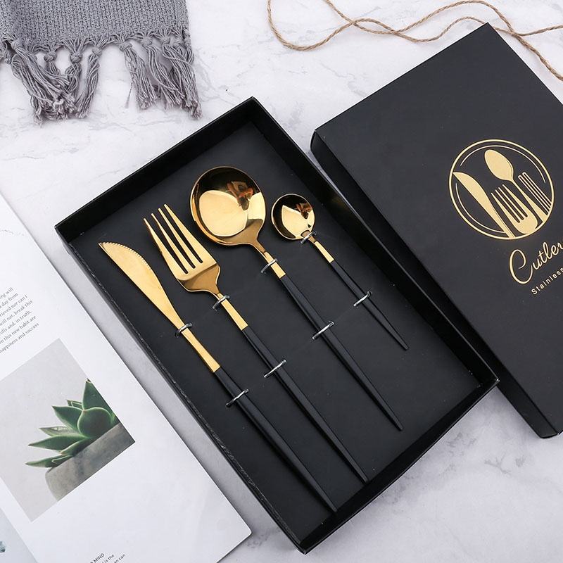 ชุด4psc บนโต๊ะอาหารสีดำส้อมและมีดสีทองกุหลาบชุดเครื่องใช้บนโต๊ะอาหารสำหรับงานแต่งงานของโรงแรม