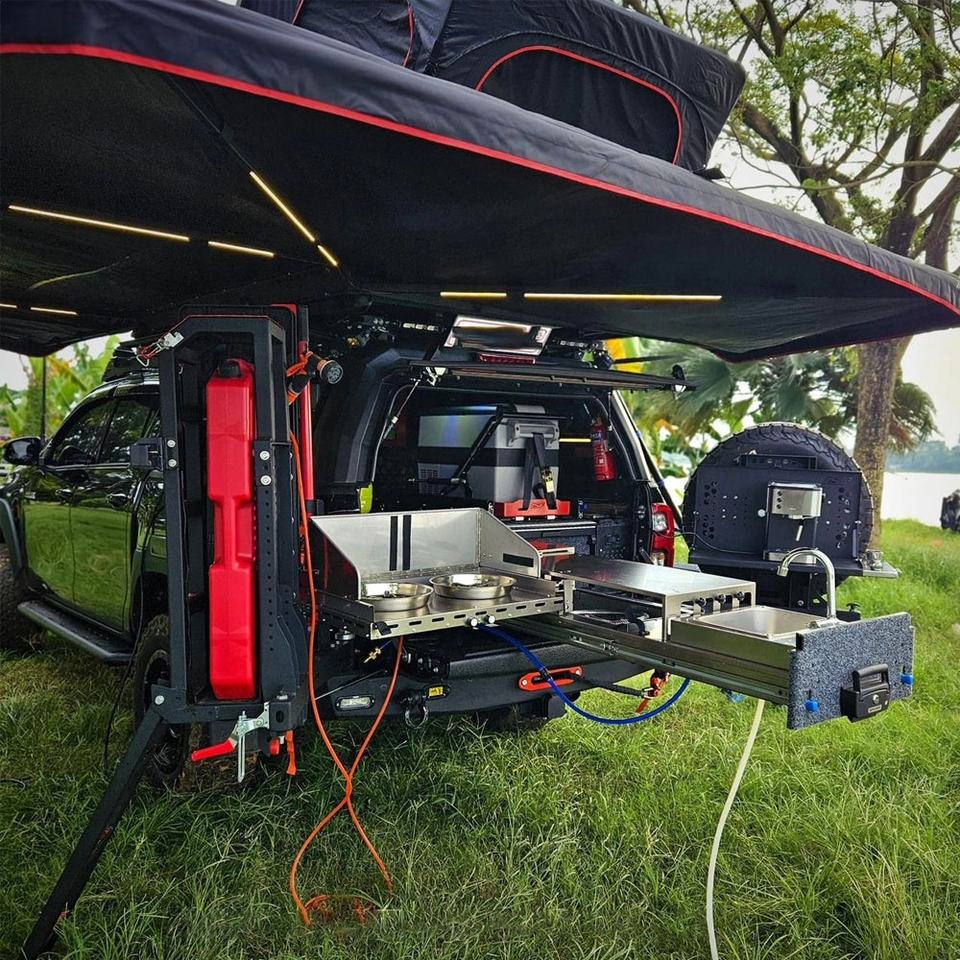 ระบบครัวกลางแจ้ง 4x4 อุปกรณ์เดินทางไกล ครัวแบบลิ้นชักในรถ สำหรับรถตู้ รถกระบะ 4WD ครัวออฟโรด ตู้เย็นแบบเลื่อน