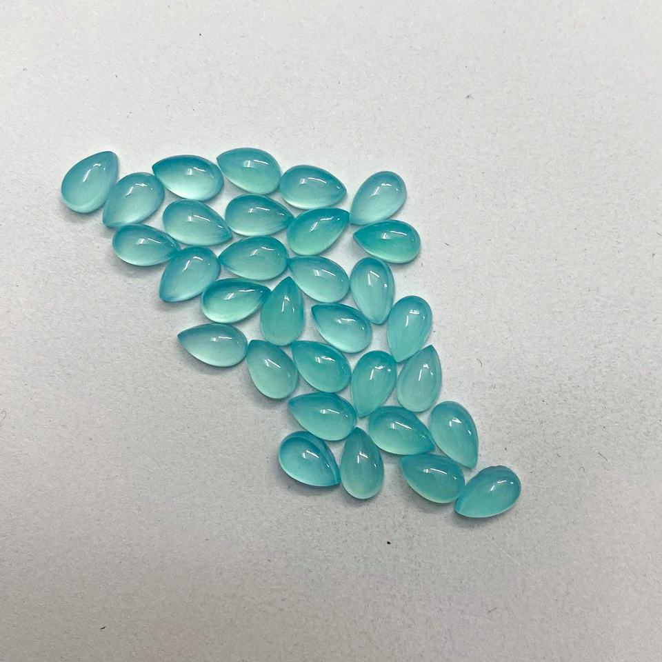 พลอยแคลเซโดนีสีน้ำเงินธรรมชาติทรงลูกแพร์ขนาด 4x6 มม. ผิวเรียบ เกรด AAA ผลิตด้วยมือในอินเดีย รับรองโดยบุคคลที่สาม ขายส่งพลอยหลวม