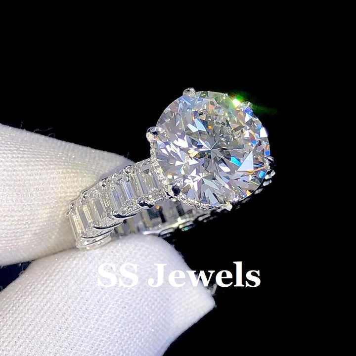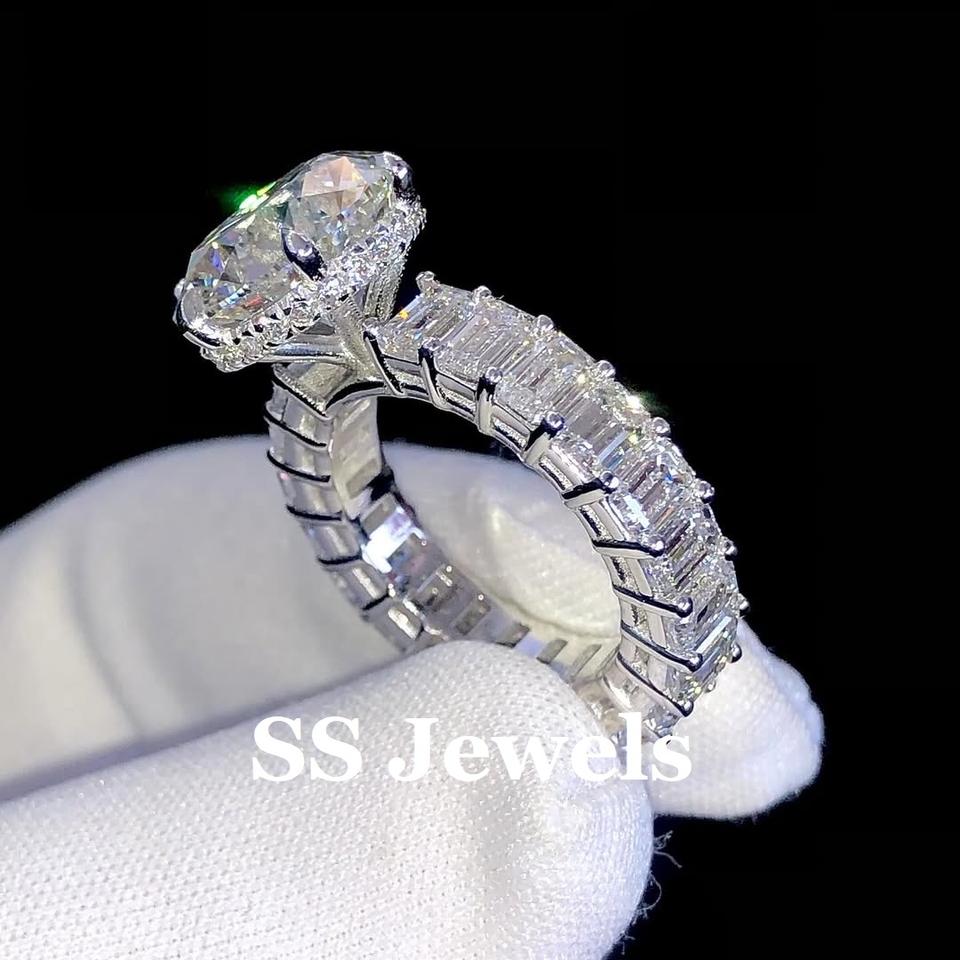 แหวนแต่งงานแบบสั่งทำพิเศษประดับเพชรโมอิสซาไนต์ 5.00 กะรัต ระดับความสะอาด VVS1 เงินแท้ 925 ชุบโรเดียม ทรงกลมเจียระไนแบบบริลเลียนท์ ฝังแบบหนามเตย วงแหวนนิรันดร์