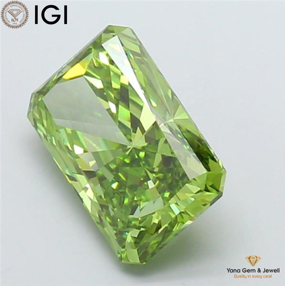 เพชร CVD ขนาด 5.02 กะรัต ทรงเรเดียนท์ ผลิตในห้องปฏิบัติการ พร้อมใบรับรอง IGI สีเขียวแฟนซีสดใส ความสะอาดระดับ VS1 สำหรับงานหมั้นแบบสั่งทำ
