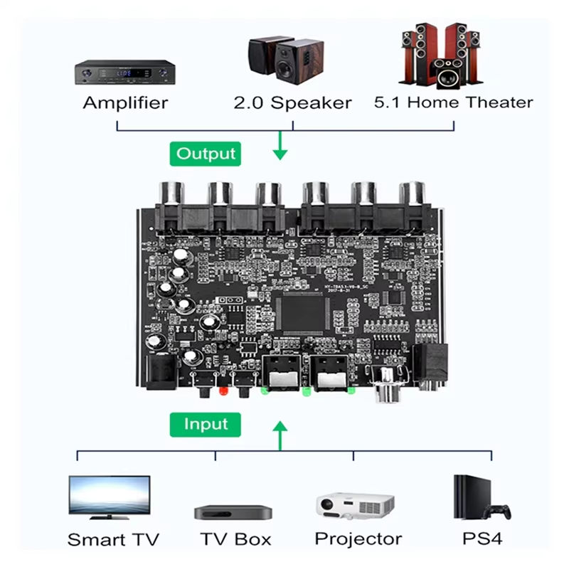 5.1/2.1 บอร์ดถอดรหัสโฮมเธียเตอร์ อินพุตออปติคอลโคแอกเชียลคู่ AUX โมดูลเสียงแบบไม่สูญเสียข้อมูล DTS ดอลบี้ ดิจิตอล ออดิโอ