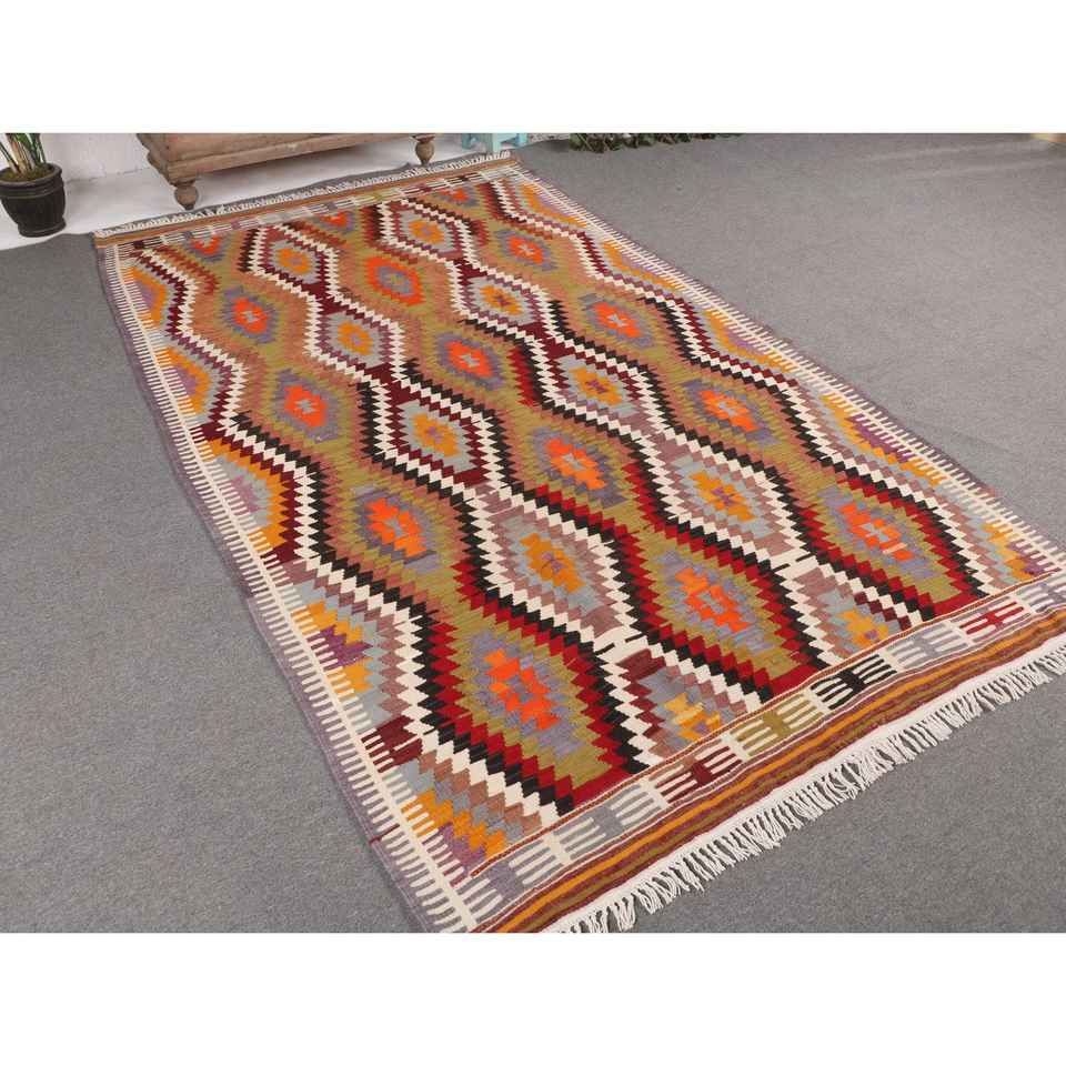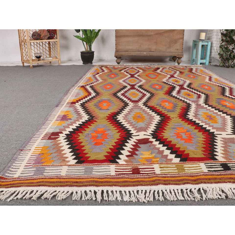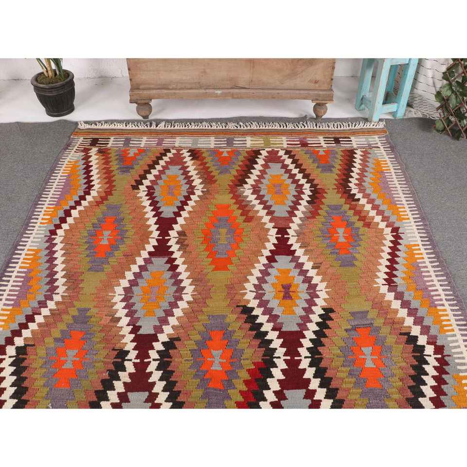 พรมคิลิมขนาด 5.2x9.3 ฟุต พรมตุรกีโบราณ พรมลายดอกไม้สีแดงส้ม