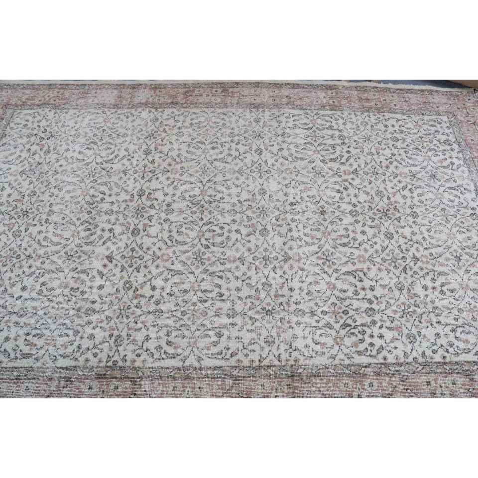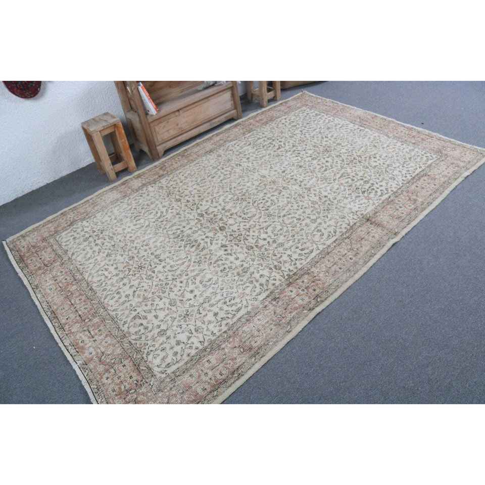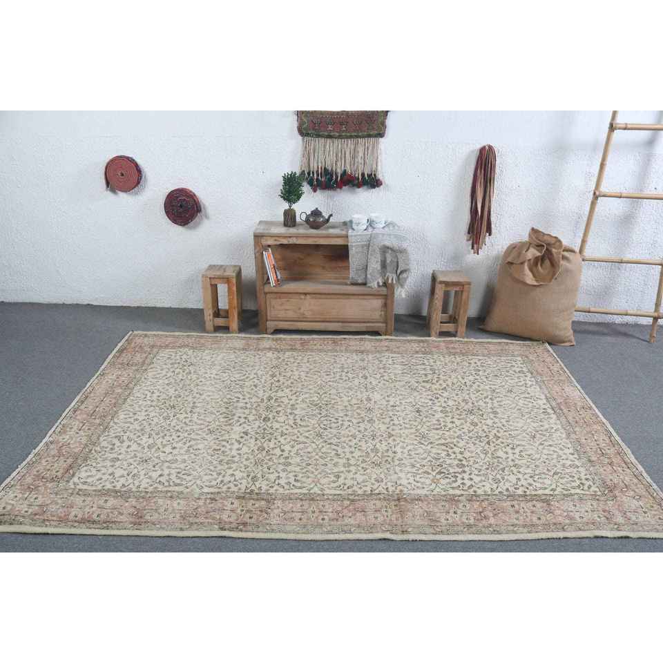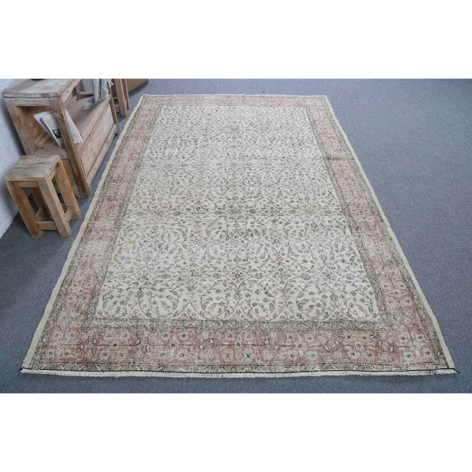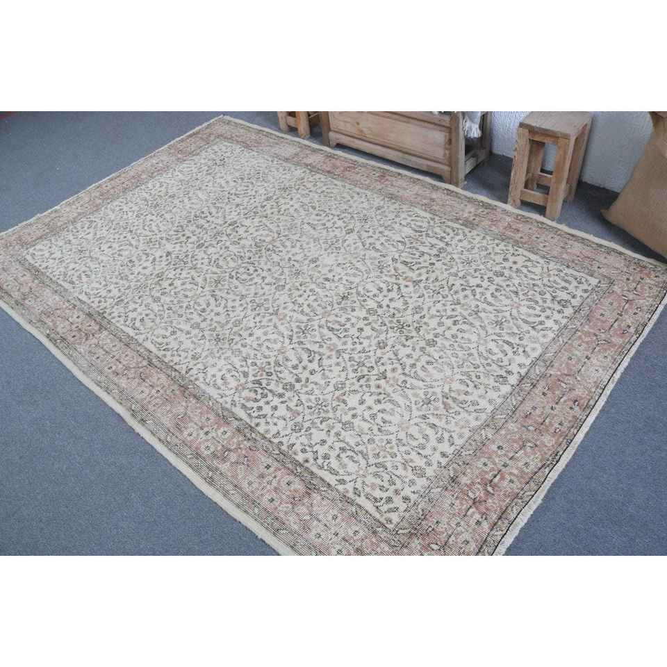 พรมขนสัตว์วินเทจขนาด 5.3x8.2 ฟุต พรมต่อผ้าสไตล์ตุรกีขนาดใหญ่ ขอบสีเทา พร้อมแผ่นรองหลังทำจากยางลาเท็กซ์