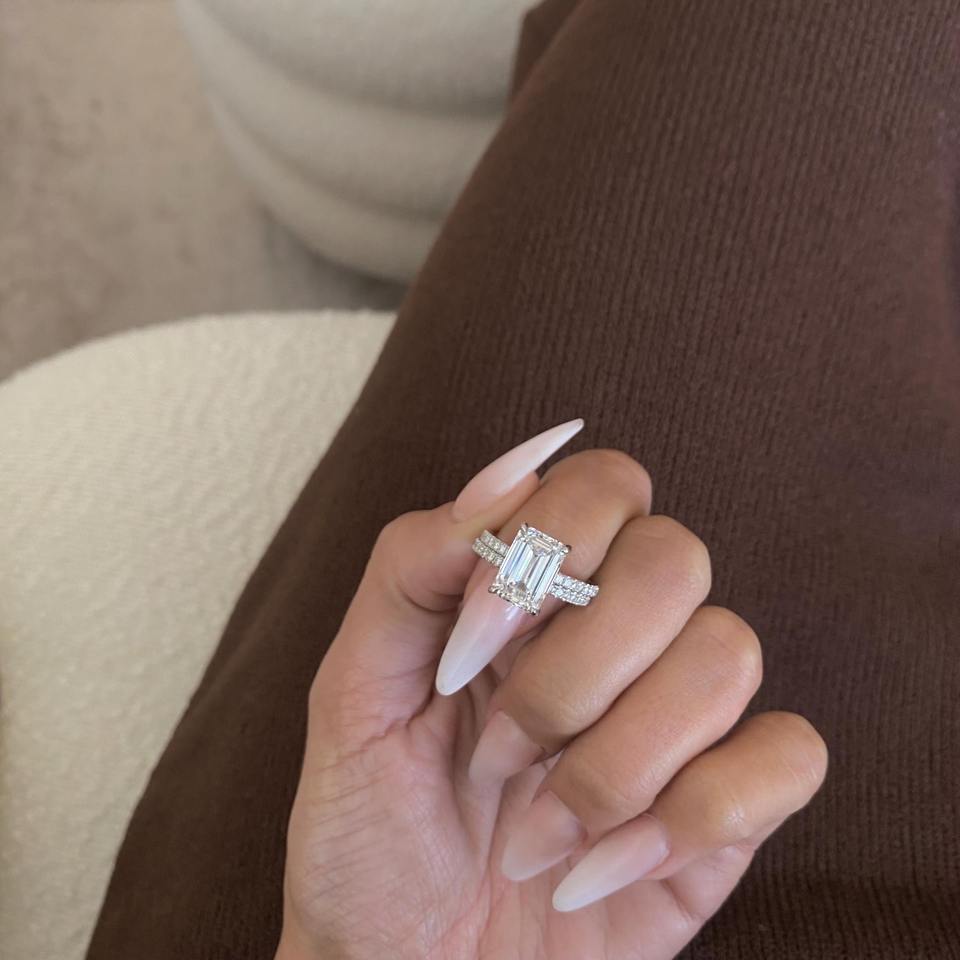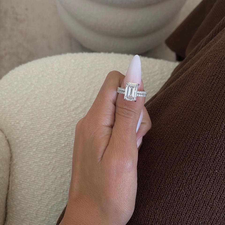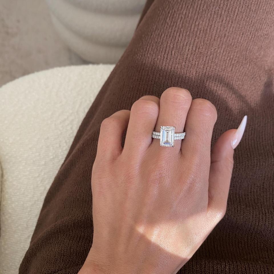 ชุดเครื่องประดับเพชรเพาะเลี้ยงทรงเอเมอรัลด์ 5.50 กะรัต _ แหวนหมั้นแบบฝังเพชรพร้อมแหวนคู่ _ ทองคำขาว 18k