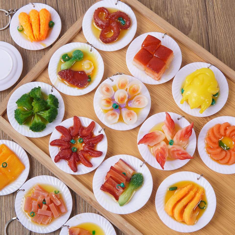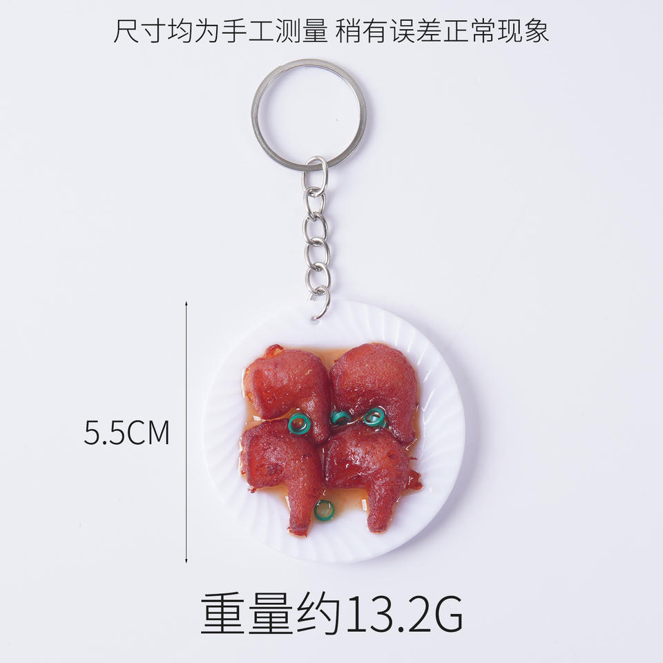 จี้รูปจานอาหารจีนจำลองขนาดเส้นผ่านศูนย์กลาง 5.5 ซม. ของเล่นพวงกุญแจรูปหมูตุ๋นและปลาตุ๋นจำลอง