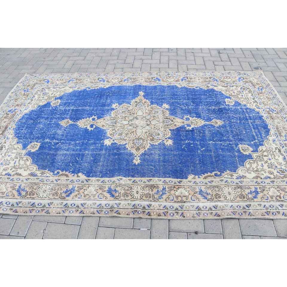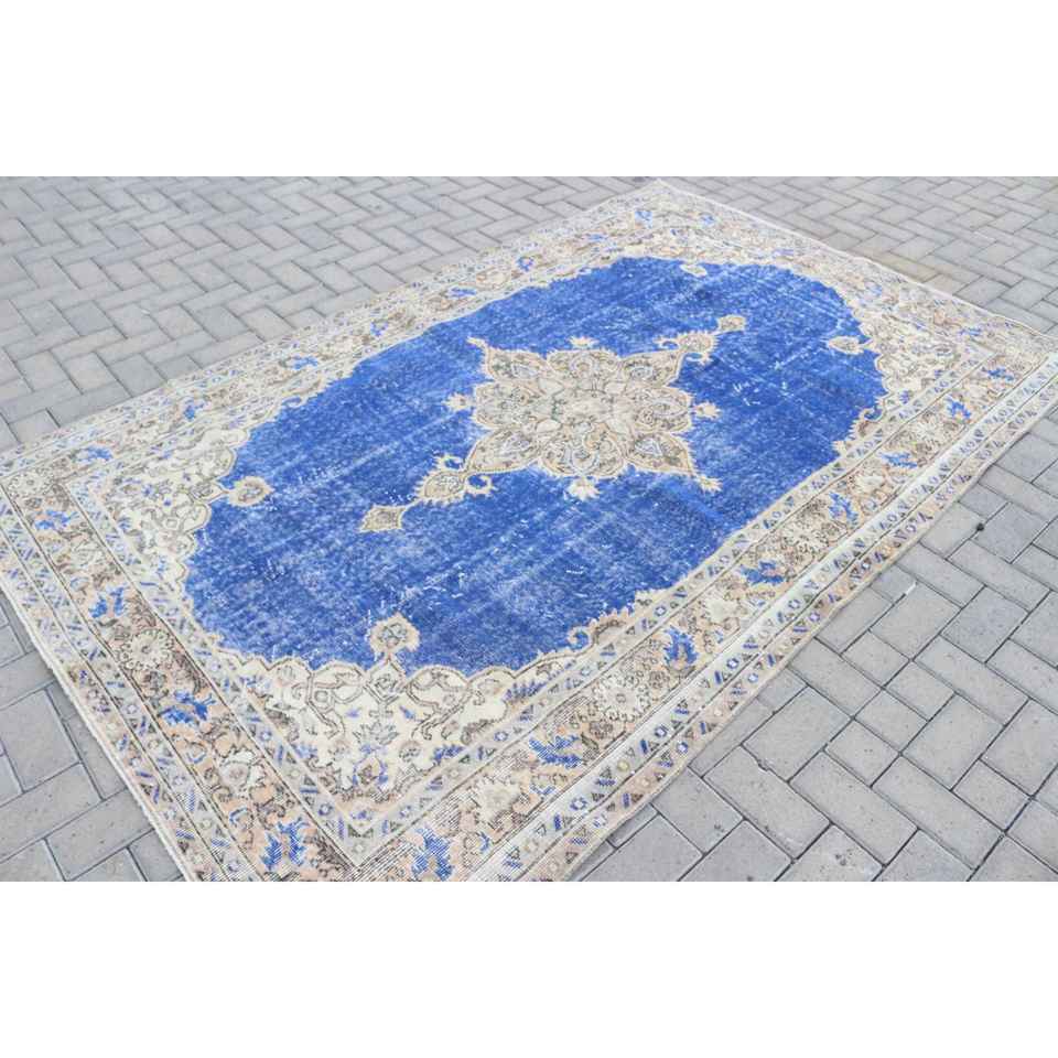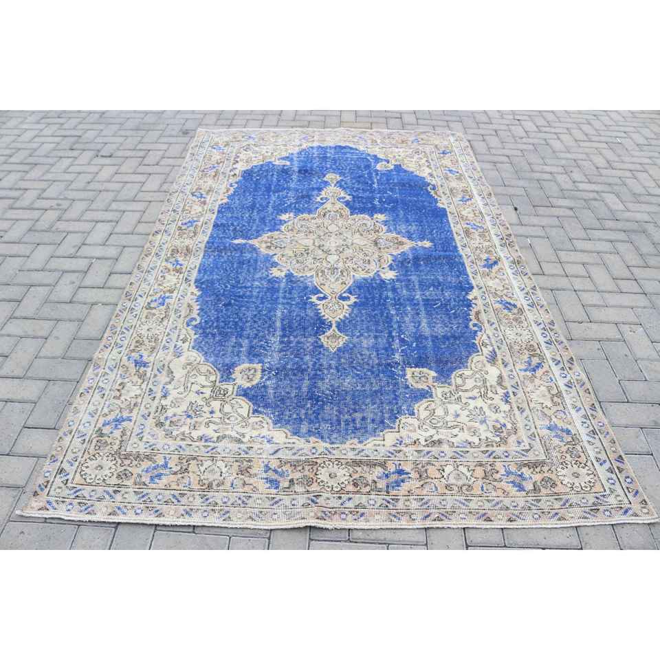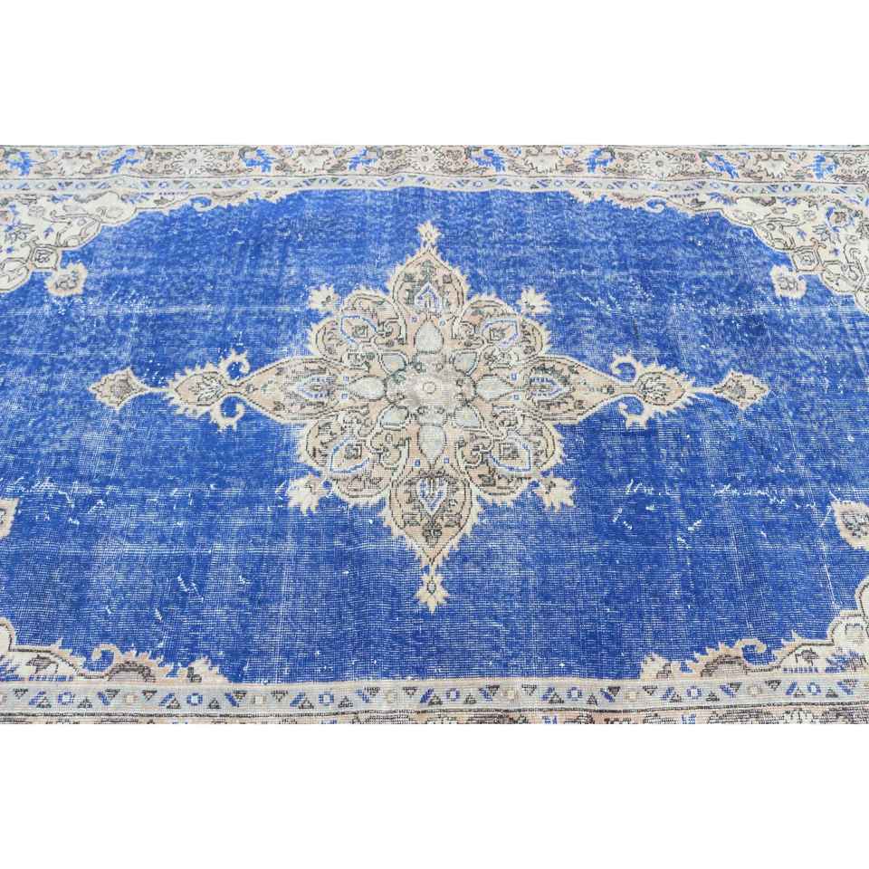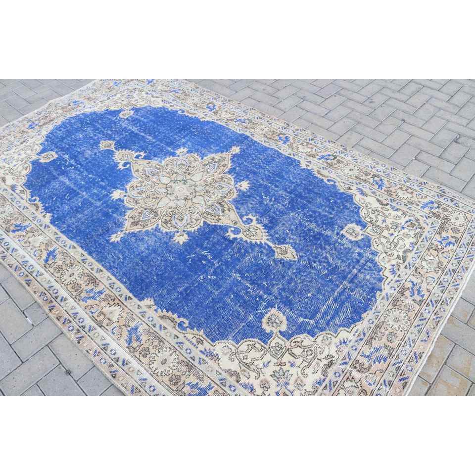 พรมวินเทจขนาด 5.5x8.7 ฟุต พรมตุรกี พรมลายพรางสีน้ำเงินทำจากขนสัตว์
