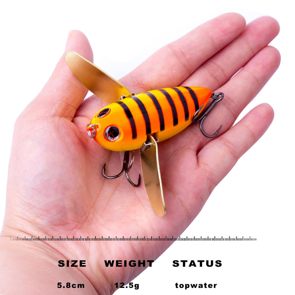 เหยื่อปลอมแบบผิวน้ำ ขนาด 5.8 ซม. น้ำหนัก 12.5 กรัม รูปทรงผึ้ง พร้อมตัวเบ็ดสามทาง ใบพัดโลหะ ปีกแบบสปูน