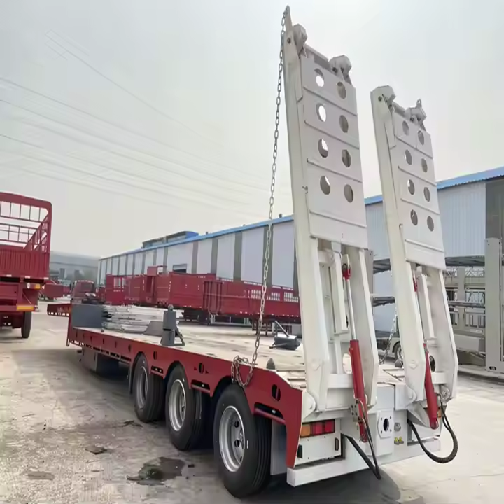 รถพ่วงพื้นต่ำไฮดรอลิก 5 เพลา สำหรับขนส่งไม้ 40-100 ตัน พร้อมคอห่านแบบยืดหดได้ รถกึ่งพ่วงหลายเพลา