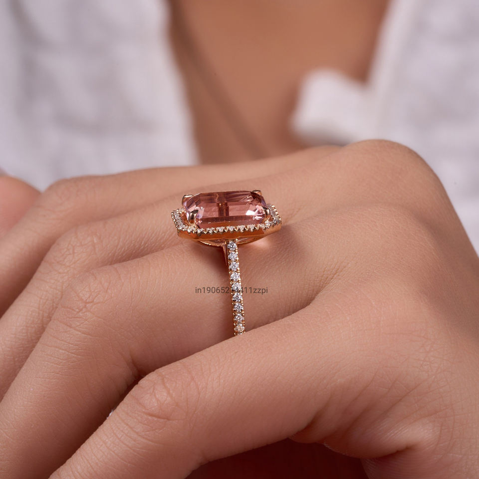 แหวนหมั้นมอร์แกไนท์ตัด5กะรัตมรกต14K แหวนเจ้าสาวสีชมพูมอร์แกนไนท์สีโรสโกลด์สำหรับเธอ