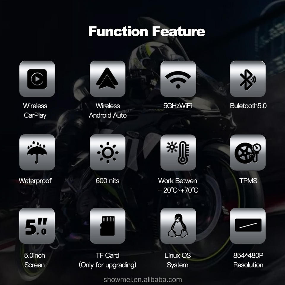 หน้าจอระบบนำทาง GPS สำหรับมอเตอร์ไซค์และรถยนต์ ขนาด 5 นิ้ว รองรับ Bluetooth, TPMS, กันน้ำระดับ IP67, ระบบสัมผัสไร้สาย, รองรับ Carplay และ Android Auto