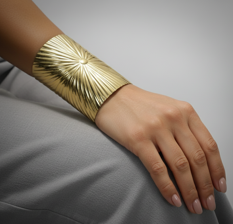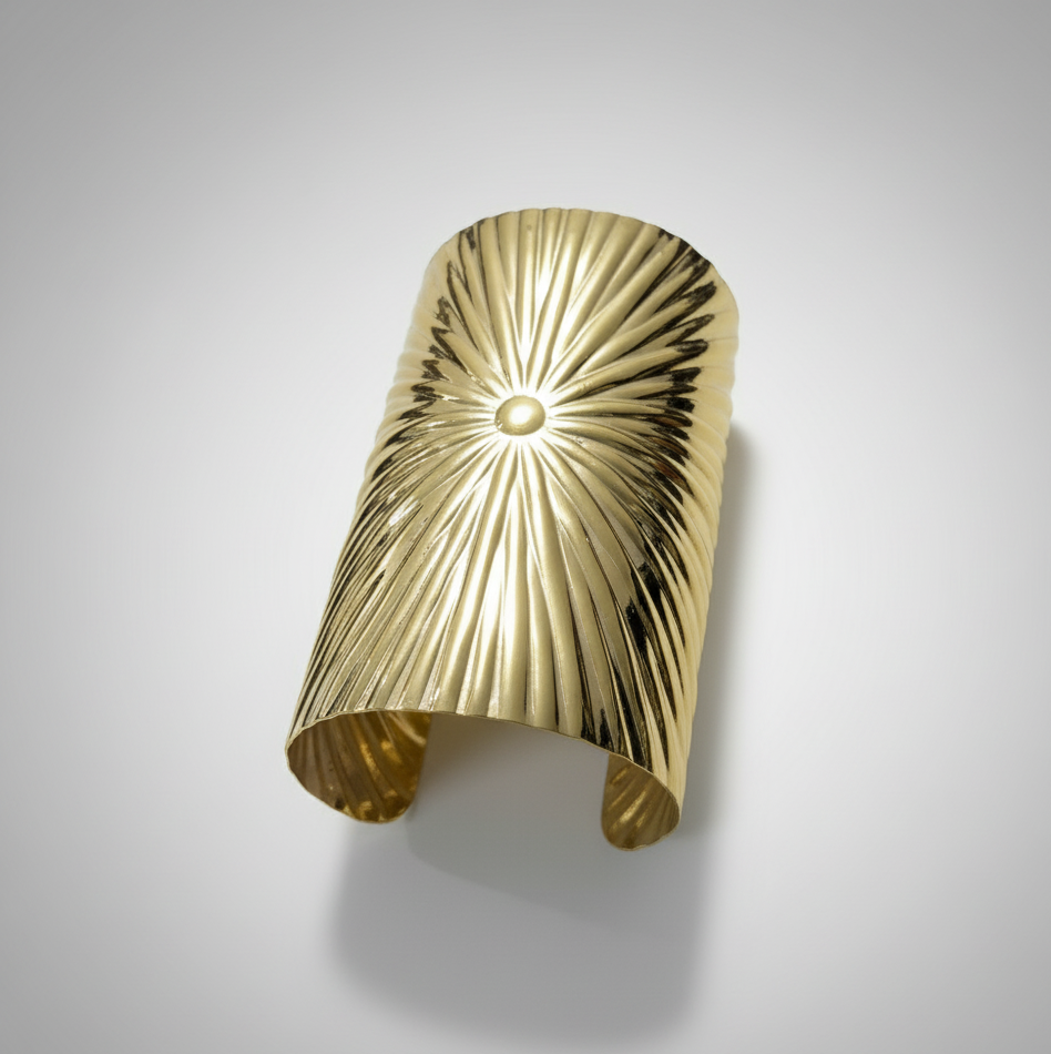 กำไลข้อมือทองเหลืองสไตล์โบฮีเมียนกว้าง 5 นิ้ว | สร้อยคอทองคำชุบลายซันเบิร์สต์ | เครื่องประดับโลหะแบบปรับได้สำหรับทุกเพศ | สไตล์แอฟริกัน |