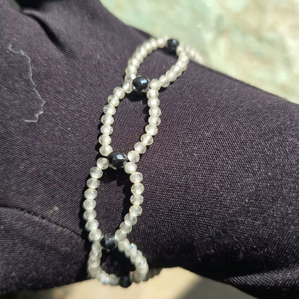 กำไลข้อมือเพชรโมอิสซาไนต์ทรงกลมสีดำ 5 มม. และสีขาว 3 มม. สวยงาม สามารถปรับขนาดได้ และเครื่องประดับเพชรอื่นๆ