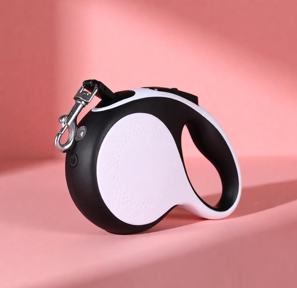 สายจูงสุนัขแบบยืดหดได้ 5 เมตร ทนทาน ทันสมัย สไตล์ตะวันตก สีขาว/ดำ ใช้งานง่าย พร้อมไฟ LED ปลดเร็ว มีถุงเก็บอุจจาระ รองรับน้ำหนักสุนัขได้ถึง 50 กก.