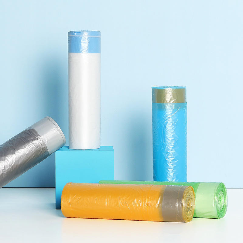 ถุงขยะแบบมีเชือกผูก ขนาด 75 แกลลอน แพ็ค 5 ใบ ผลิตจากพลาสติก PE หนาพิเศษ สีดำ สำหรับใช้ในครัวเรือน พร้อมพิมพ์โลโก้ตามสั่ง ดีไซน์แข็งแรงทนทาน