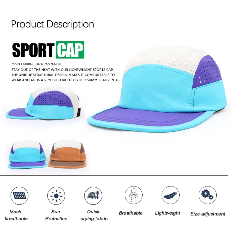 หมวกผ้าฝ้าย100% เชือกรูดสำหรับวิ่ง5แผงหมวกทรงสามเหลี่ยมมีรูปิดแบบ SnapBack ดีไซน์ด้วยเลเซอร์สำหรับเล่นกีฬา