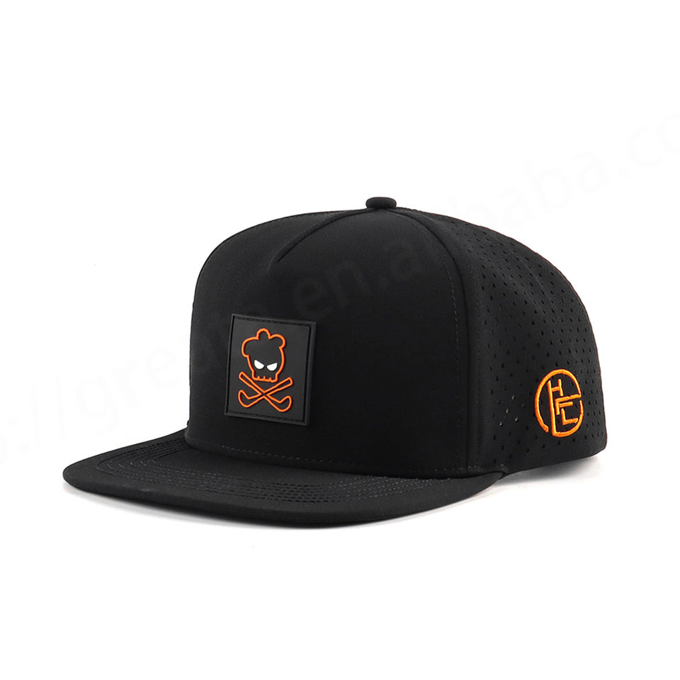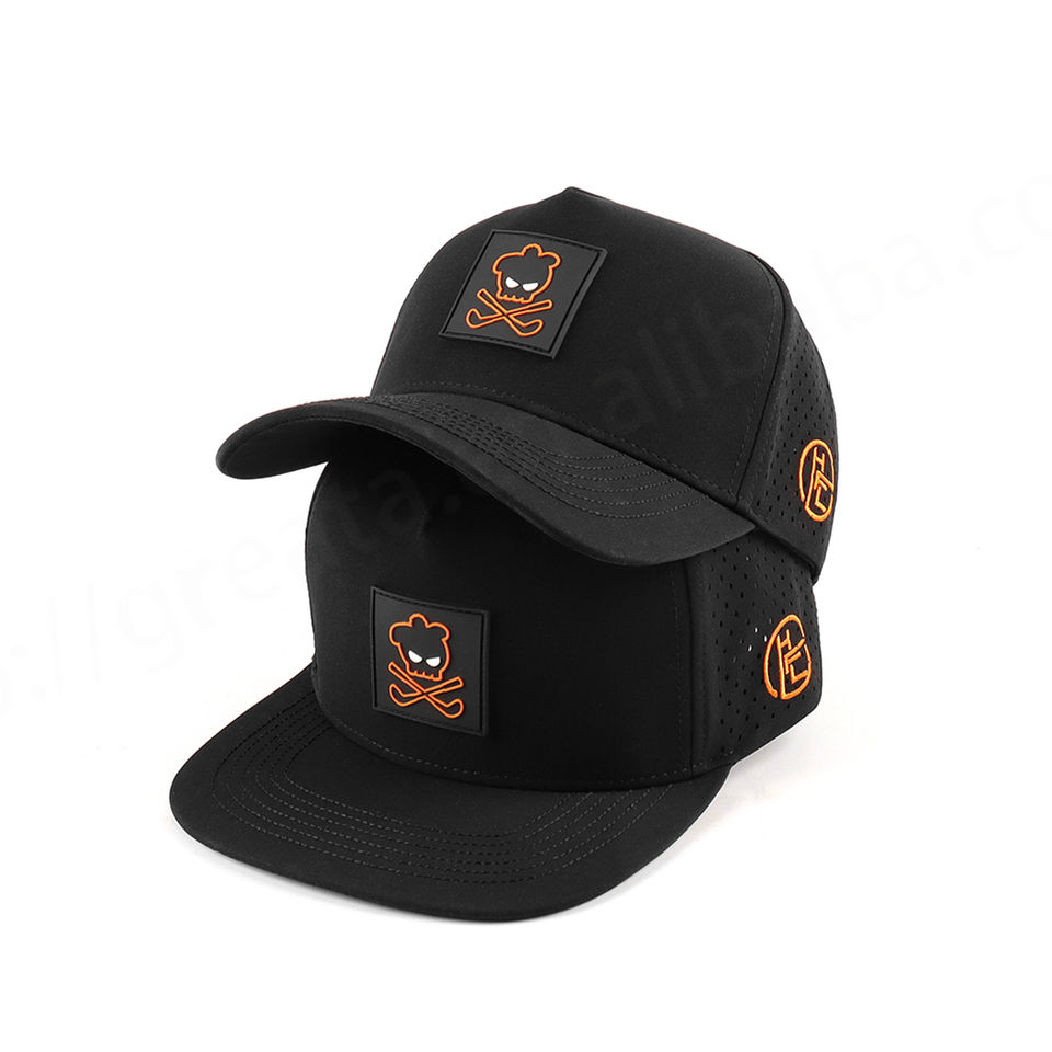 หมวก Snapback แผ่นยางรูตัดด้วยเลเซอร์5แผงโลโก้ที่มีคุณภาพสูงโครงสร้างแบบเจาะรูสำหรับกลางแจ้ง