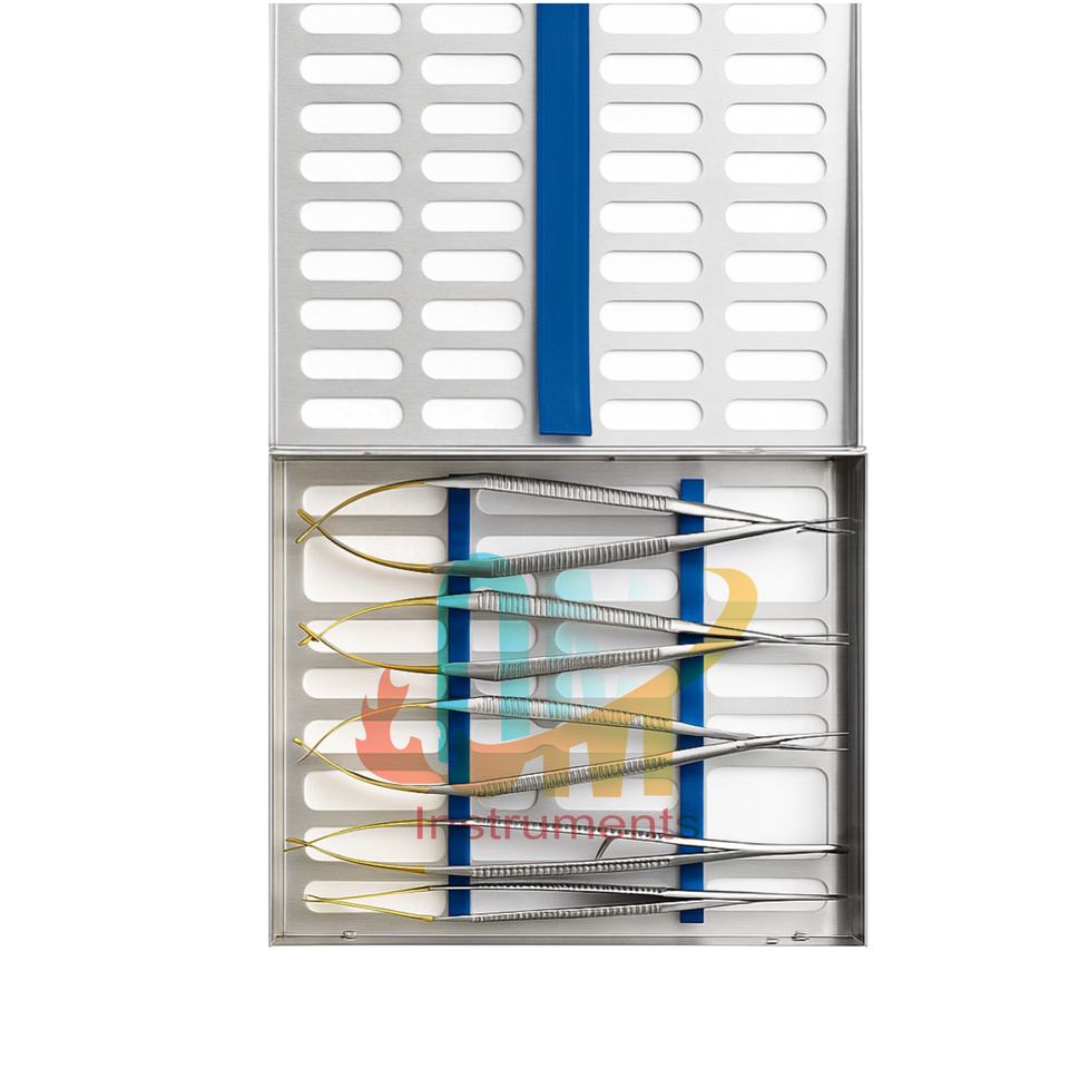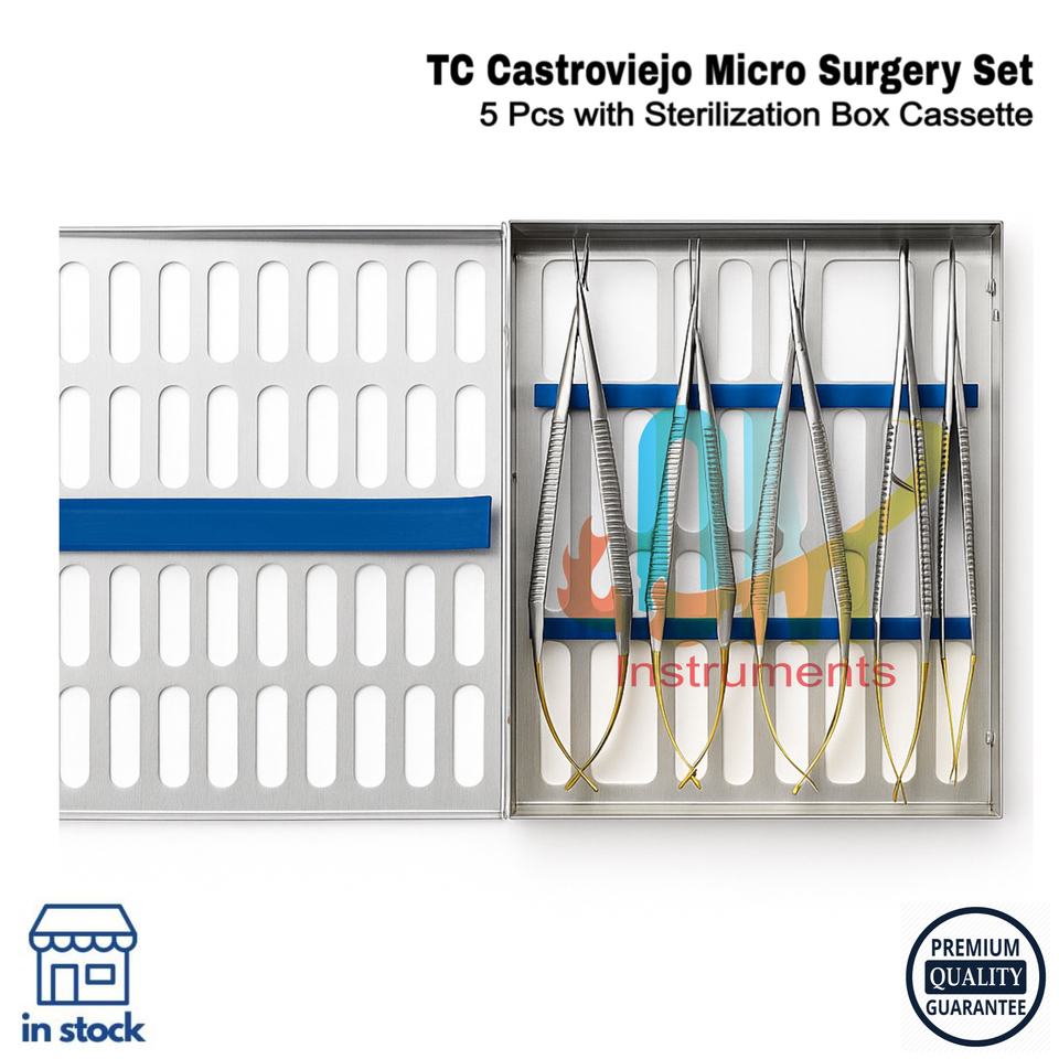 ชุดเครื่องมือผ่าตัดขนาดเล็ก TC Castroviejo 5 ชิ้น พร้อมกล่องฆ่าเชื้อแบบ Cassette คุณภาพสูง ผลิตจากเหล็กกล้าไร้สนิมเยอรมัน | โอลด์เมด